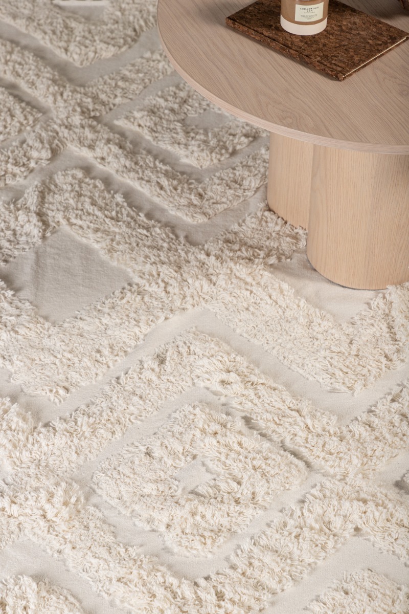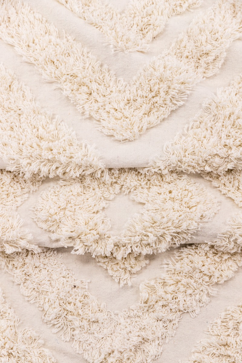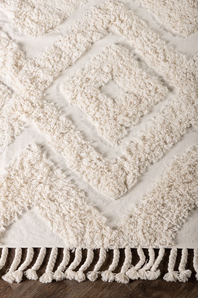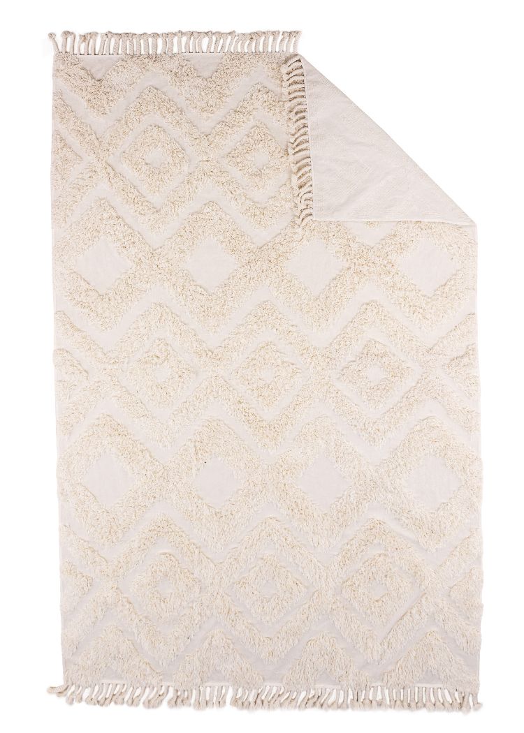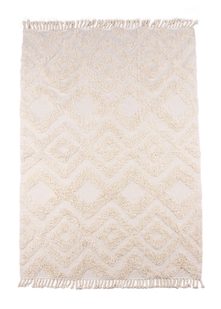 Mjukt och slitstarkt vitt bomullsmatta med fluffig yta och dekorativa fransar. Skapar en ombonad atmosfär i varje rum, perfekt vid sängen eller soffan.