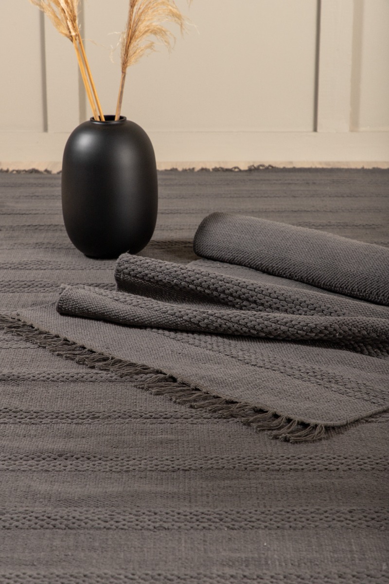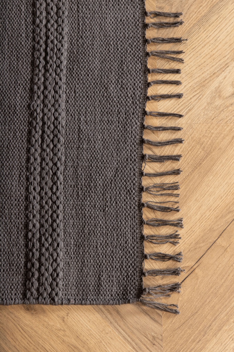 Skapa värme och stil med Rosita handvävd bomullsmatta i grått. Mjuk ullblandning och dekorativa detaljer för ett inbjudande rum.