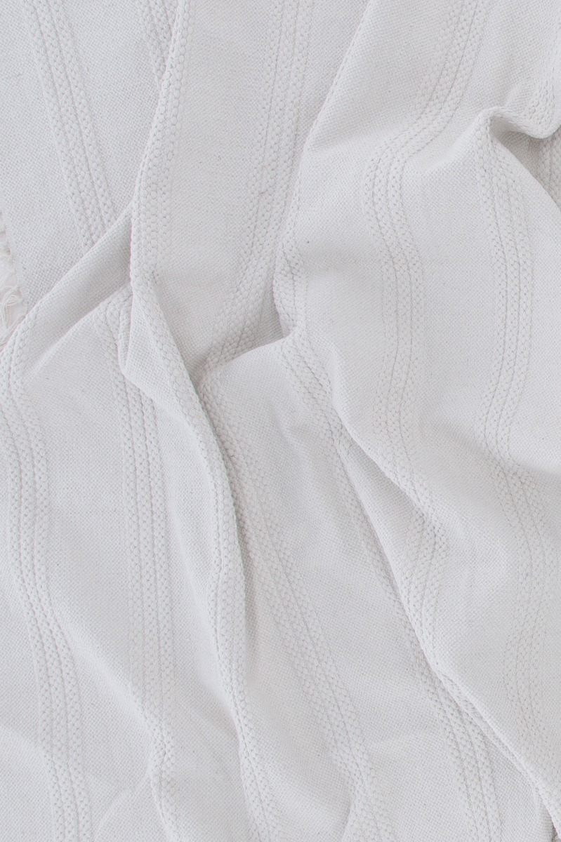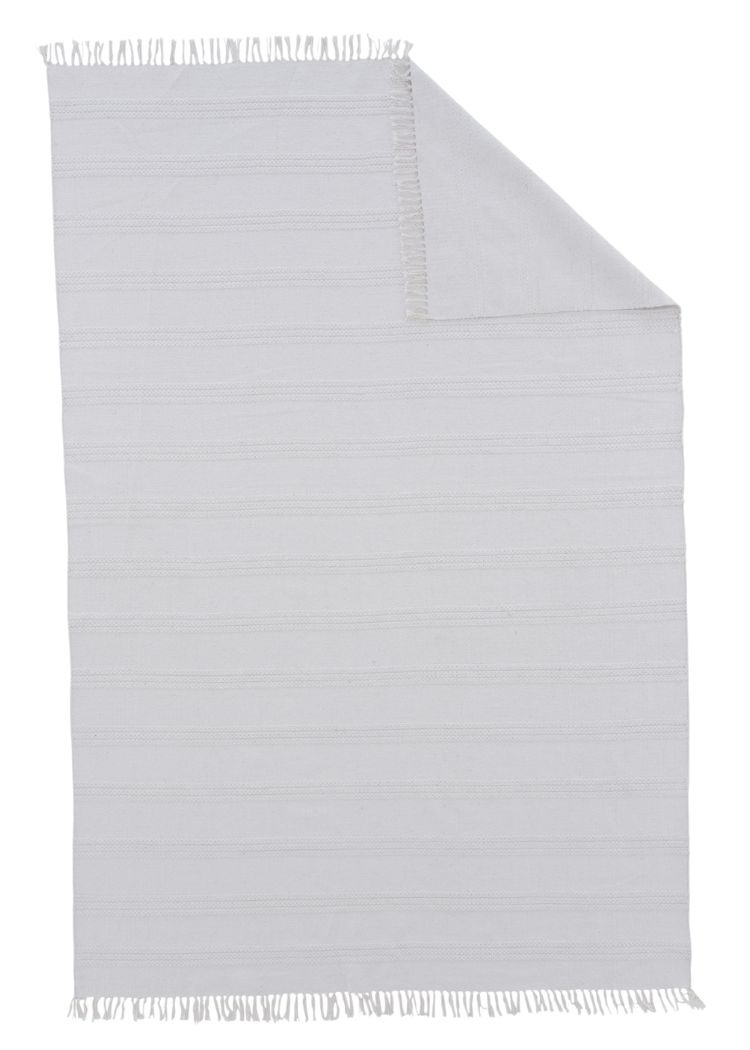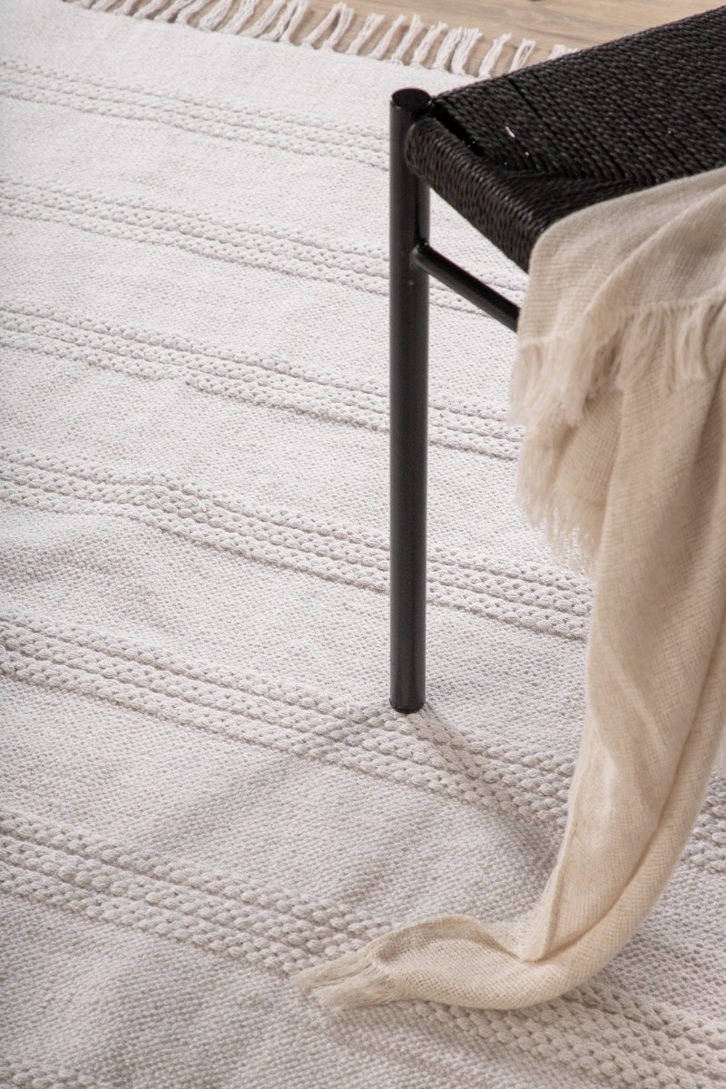 Handvävd bomullsmatta i mjuk offwhite färg med dekorativa fransar. Ger ditt rum värme och stil med en tidlös design och generös storlek.