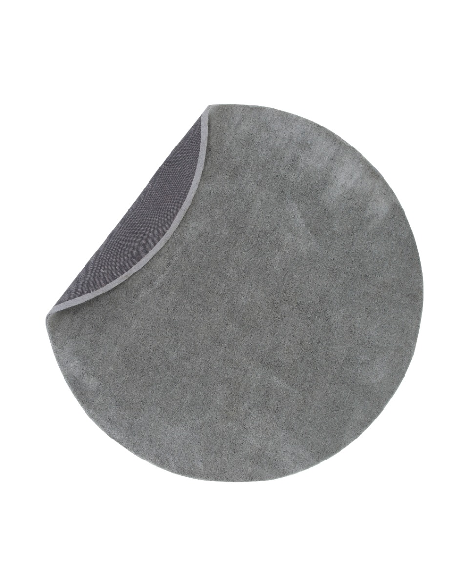 Elegant rund ryamatta i mjuk silverfärgad polyester med cirka 15 mm tjocklek. Perfekt för att skapa komfort och stil i hemmet.