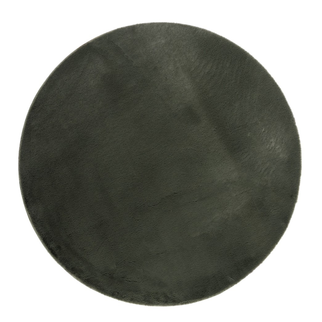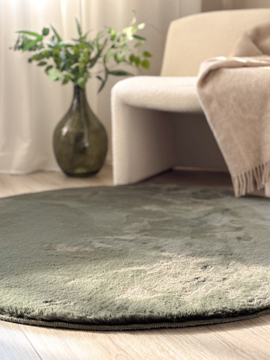Mjukt rund grön matta med pälslook och 25 mm tjocklek. Miljövänlig och elegant, perfekt för att skapa värme och komfort i ditt hem.