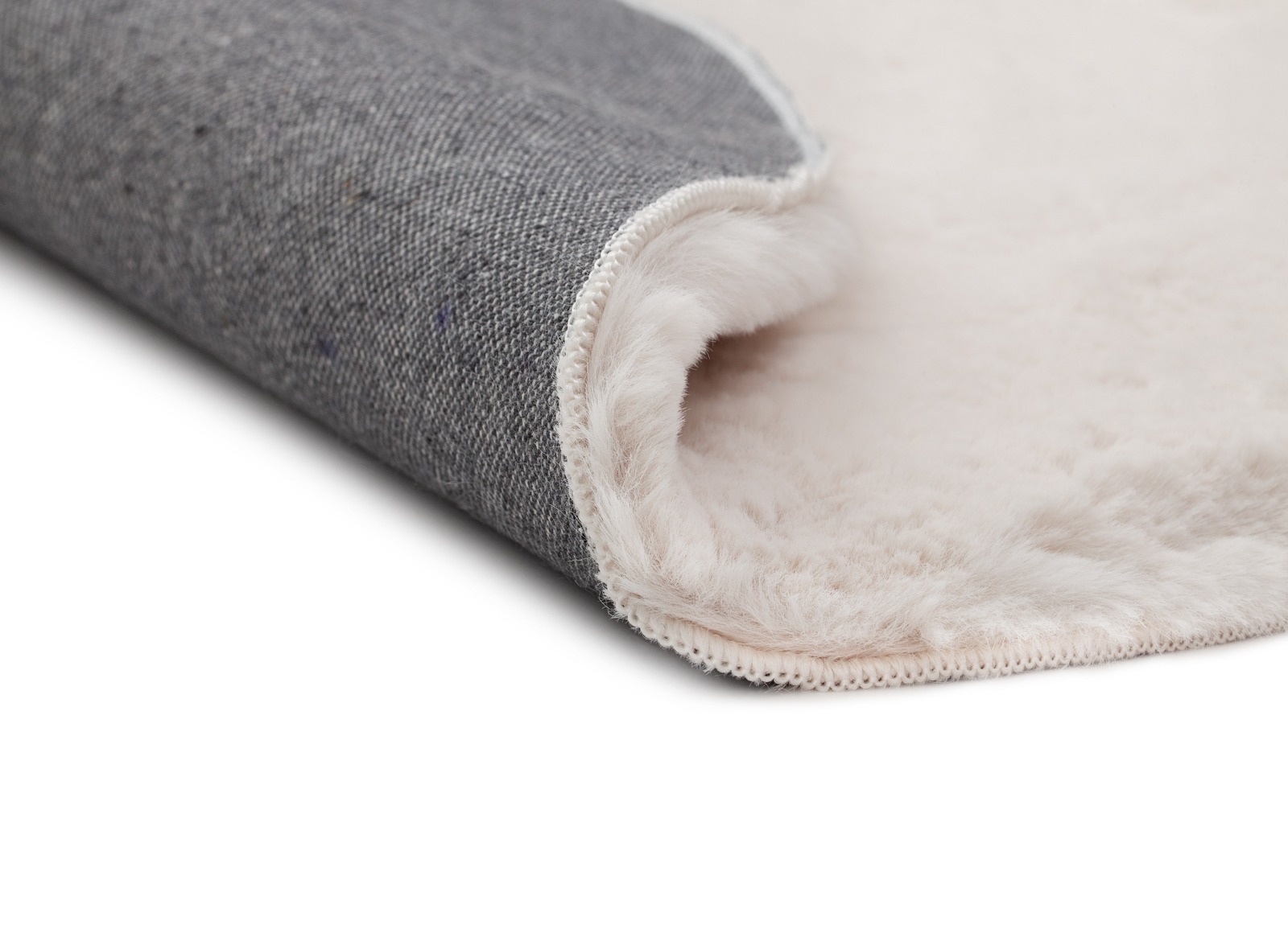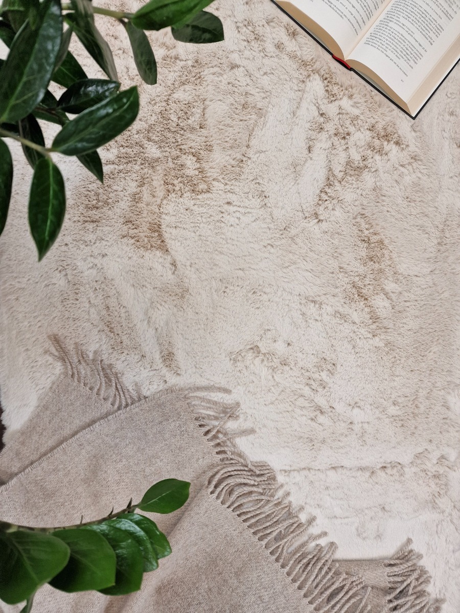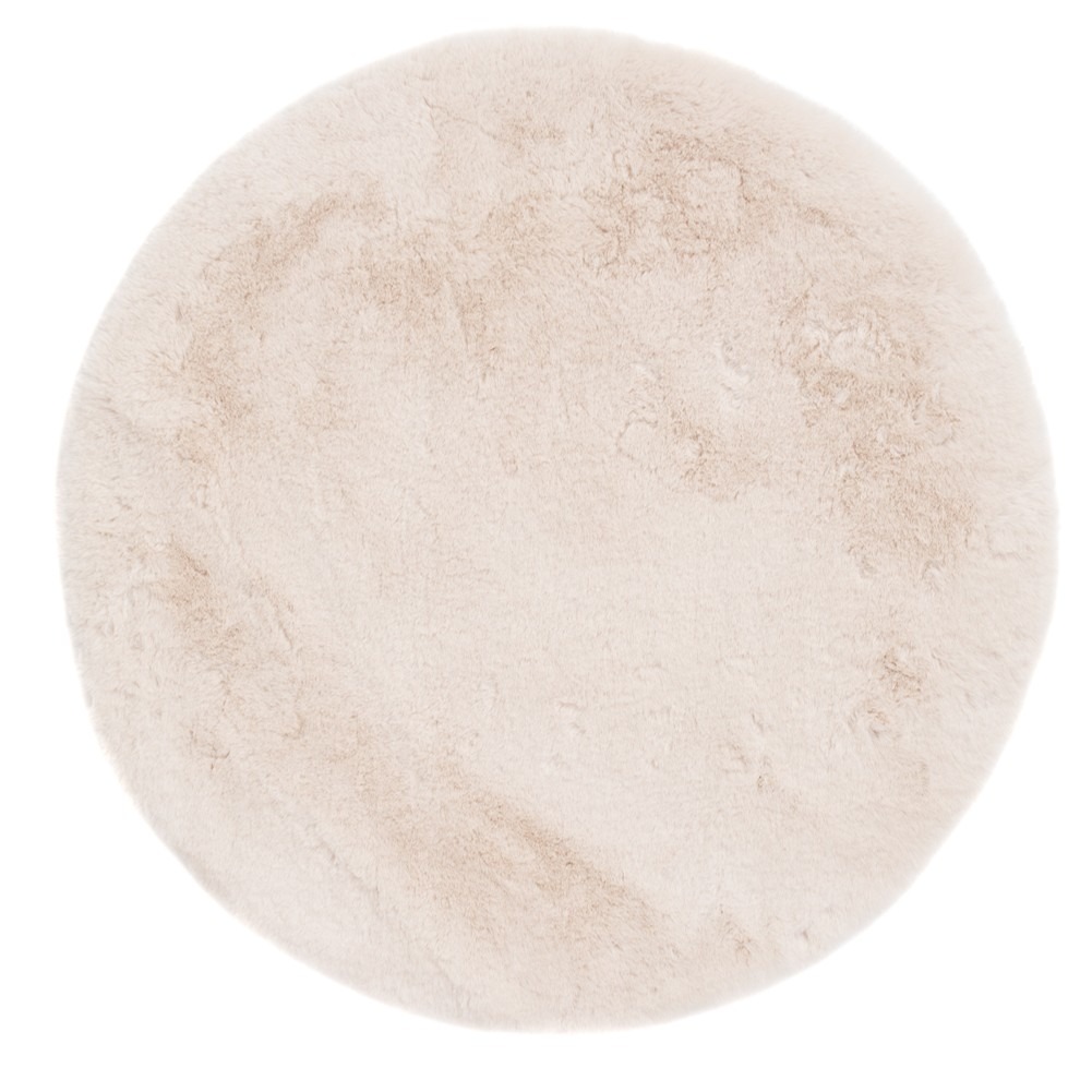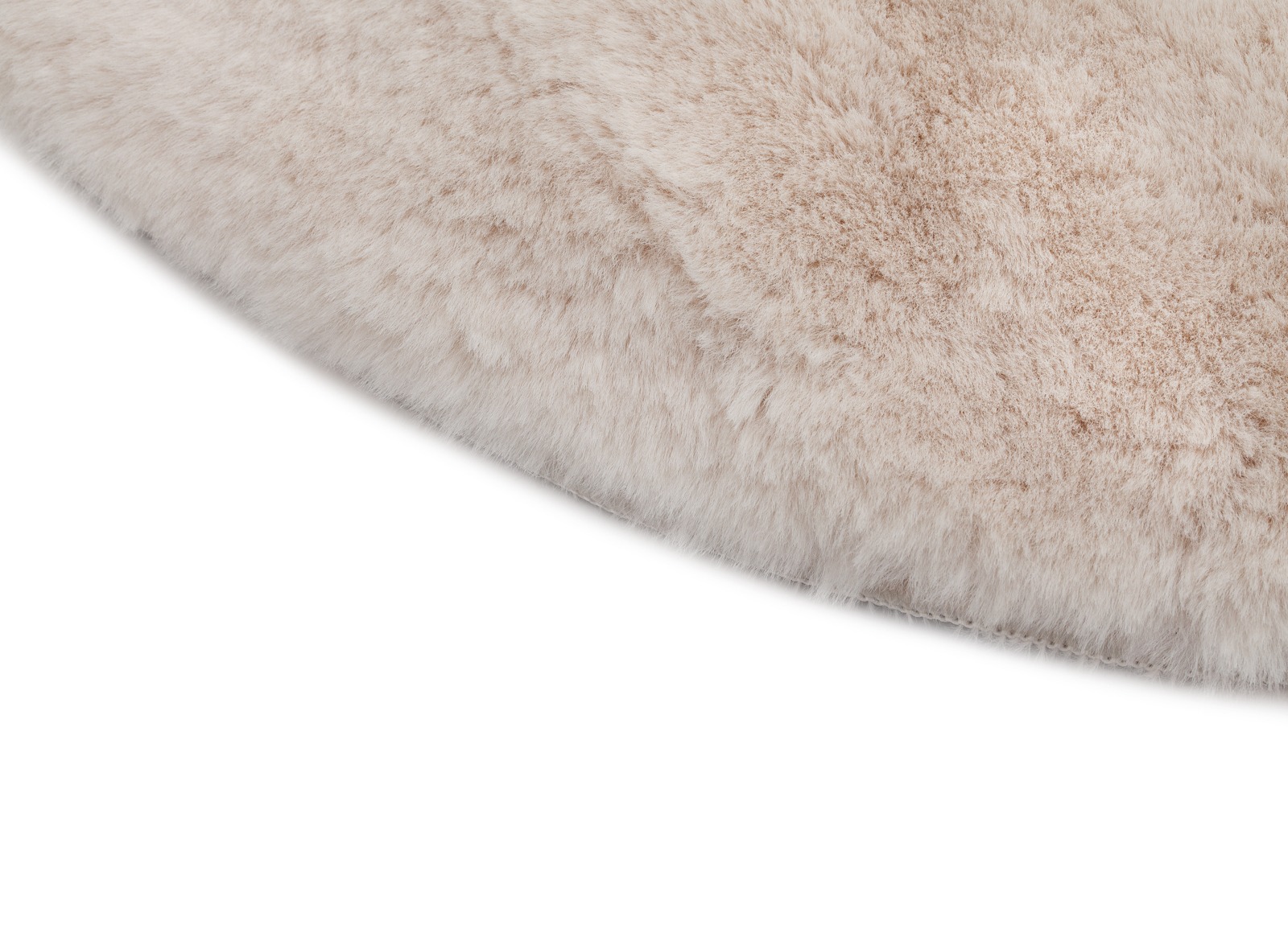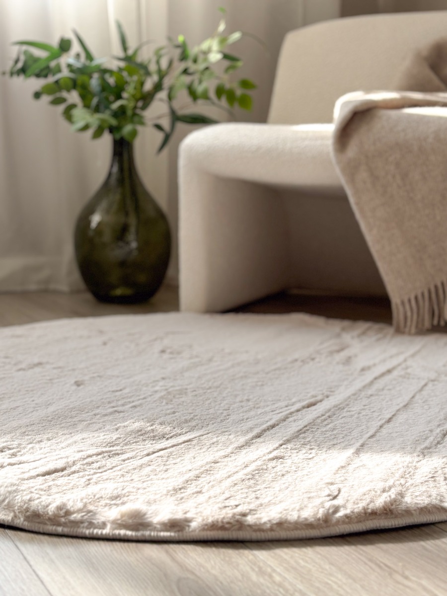 Rund mjuk matta med fluffig pälslook i varm beige ton. Perfekt för att höja mysfaktorn i sovrum och vardagsrum med naturlig elegans.