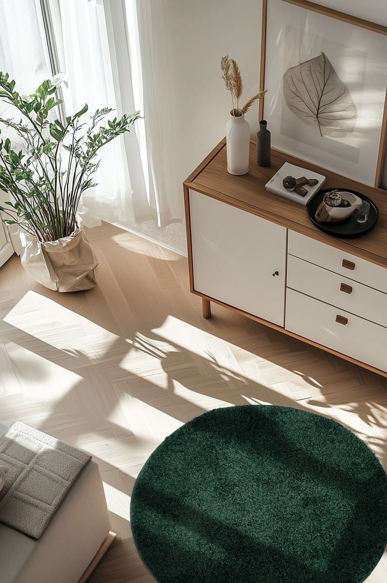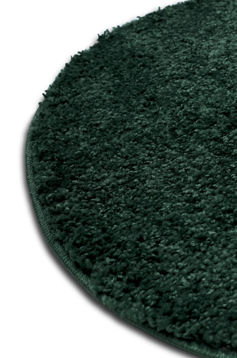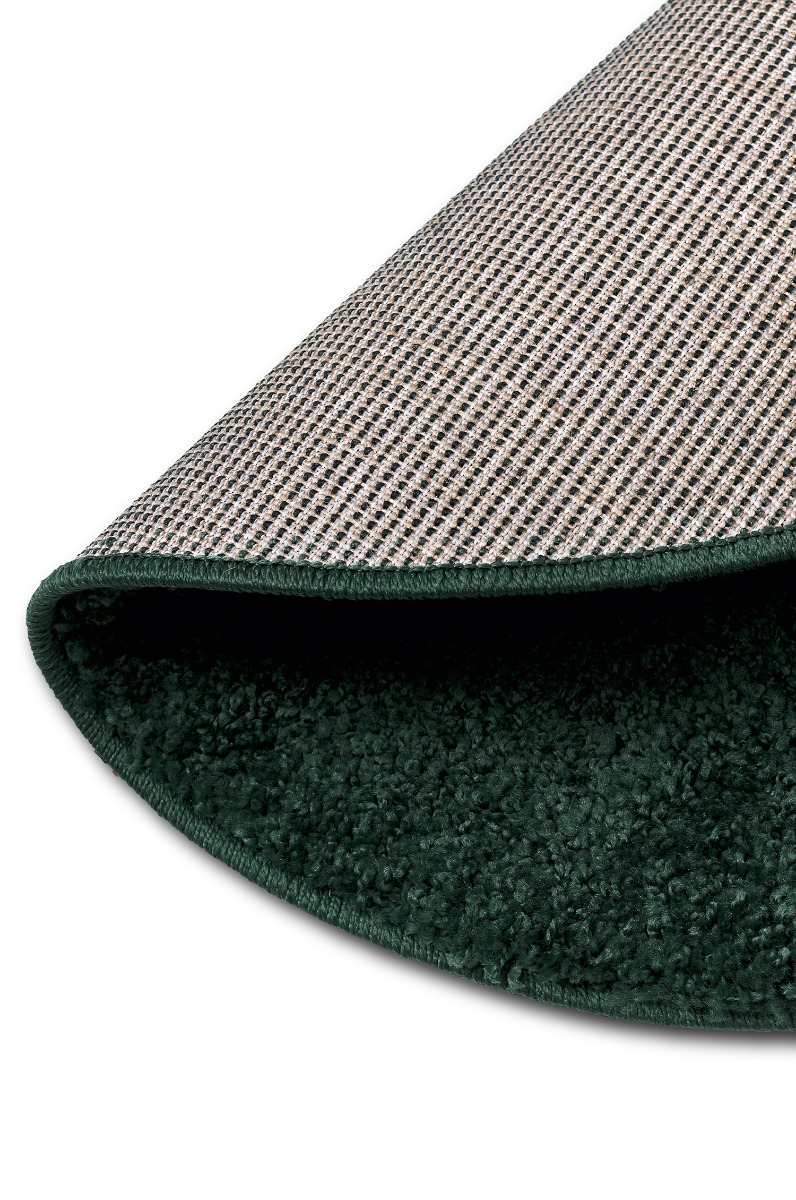 Mjuk och slitstark rund ryamatta i mörkgrön polypropylen. Ger komfort och värme till rummet med sin tjocka, mjuka struktur.