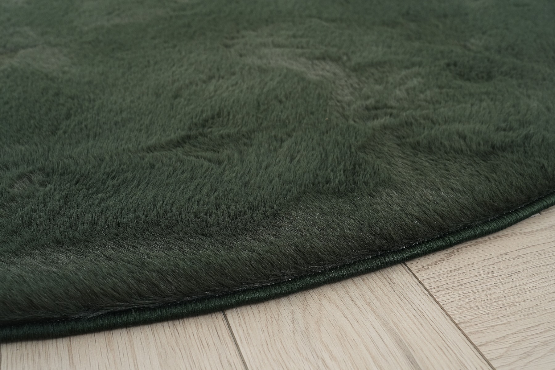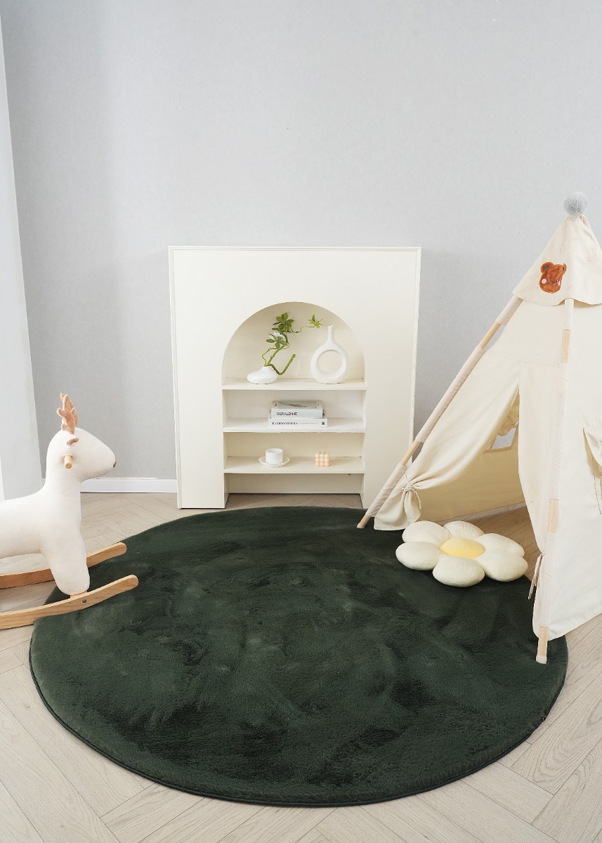 Mjukt och tjockt rund pälsmatta i mörkgrönt. Allergivänlig och lättskött med elegant design som skapar komfort i alla rum.