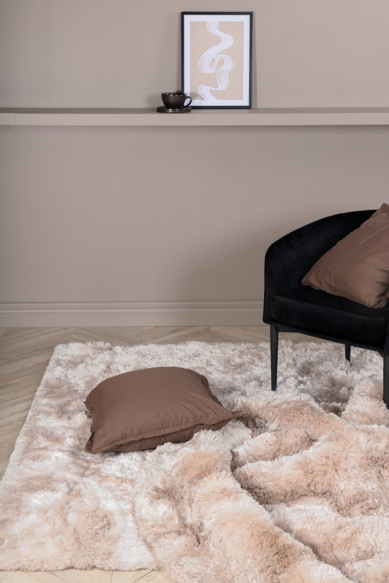 Mjukt och tåligt beige ryamatta i bomull och polyester med 40 mm tjocklek. Perfekt för att skapa värme och komfort i ditt rum.