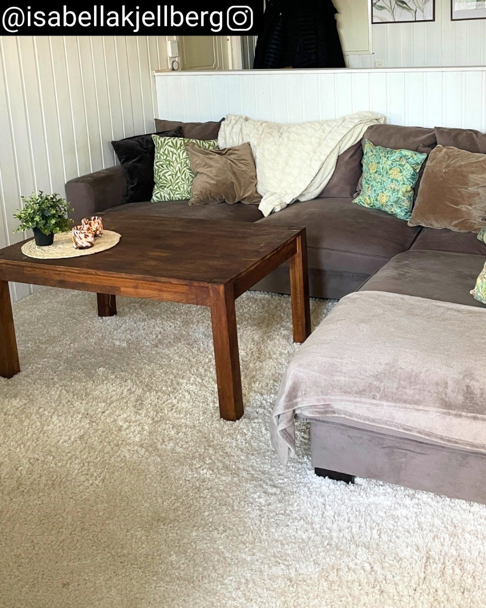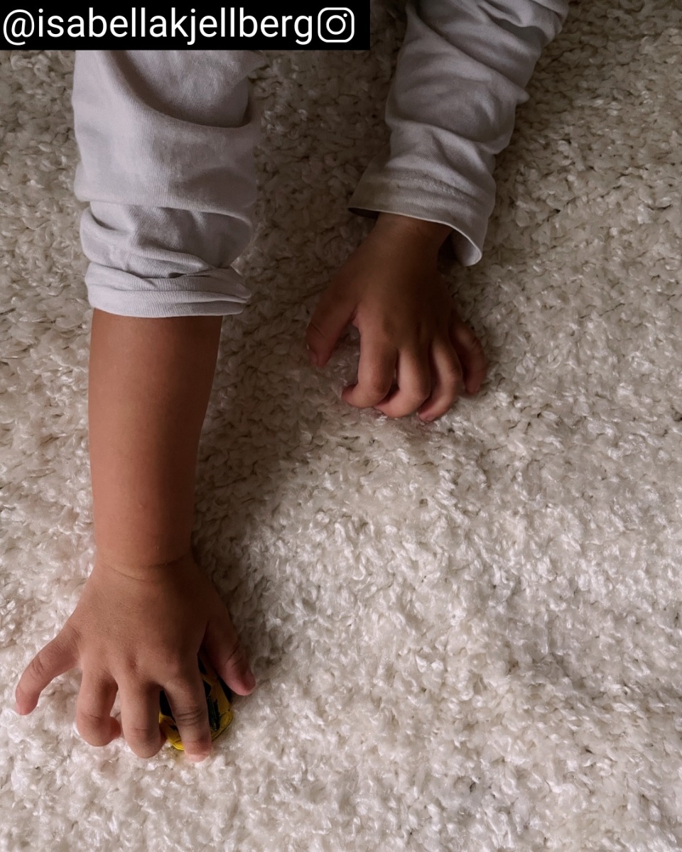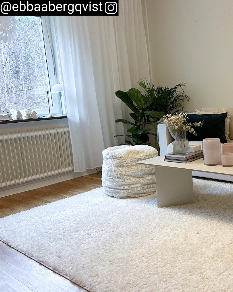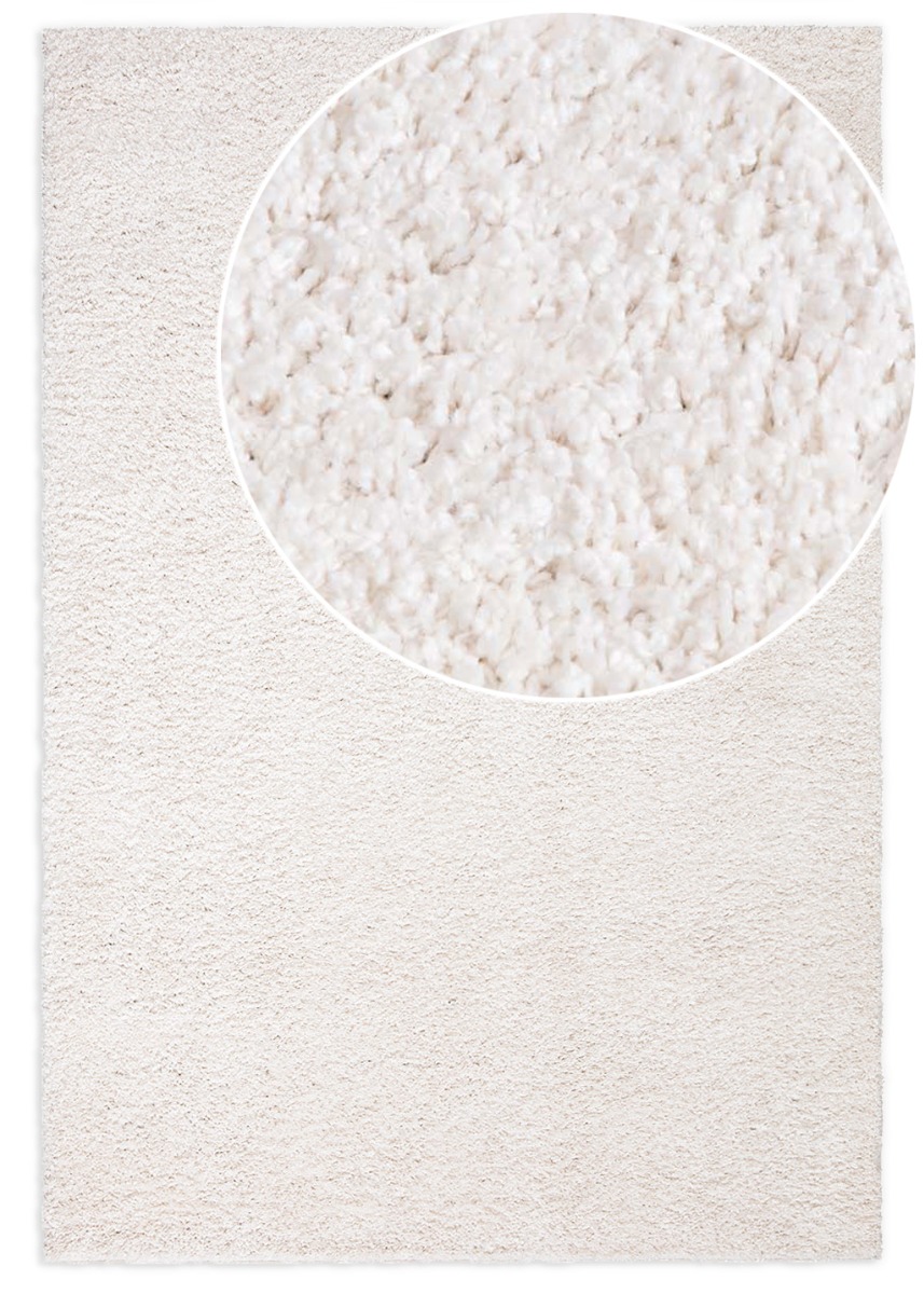 Fluffig offwhite ryamatta i mjuk polypropylen med tjock plysch och Oeko-Tex-certifiering. Perfekt för en varm och stilren känsla i hemmet.