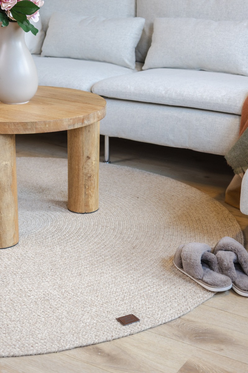Handvävd linnefärgad ullmatta med mjukt tvinnat mönster som tillför värme och struktur till ditt hem. Perfekt för både moderna och klassiska miljöer.