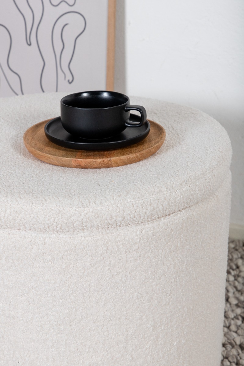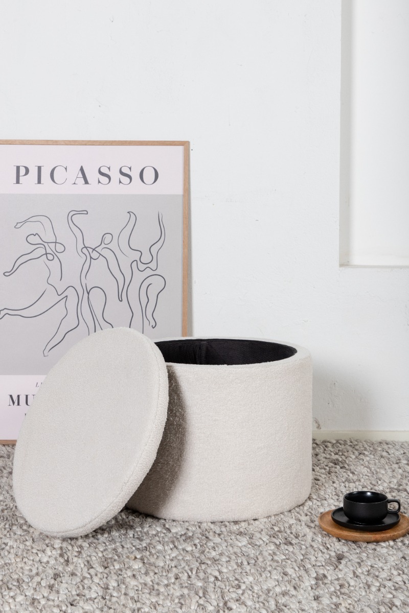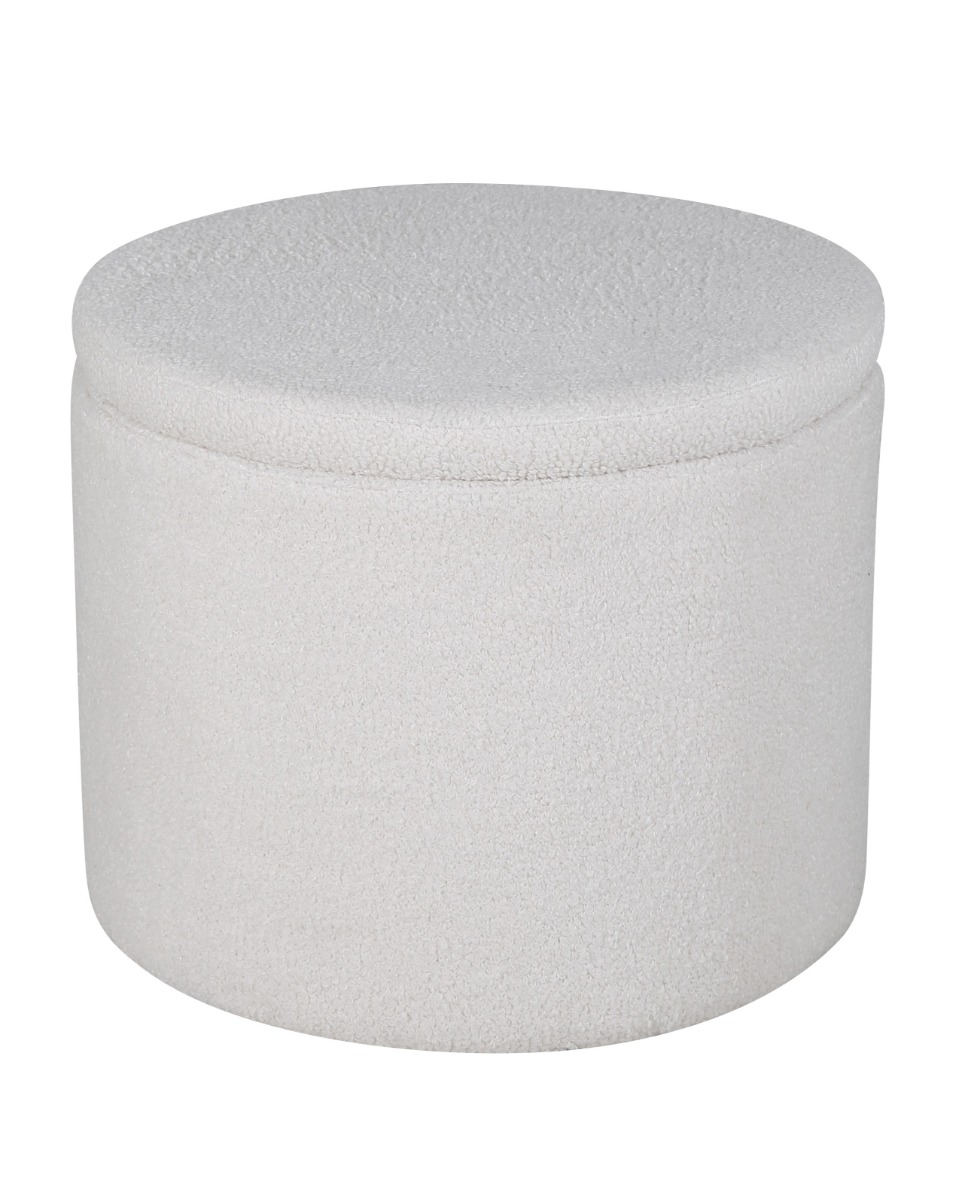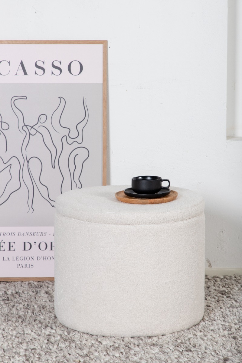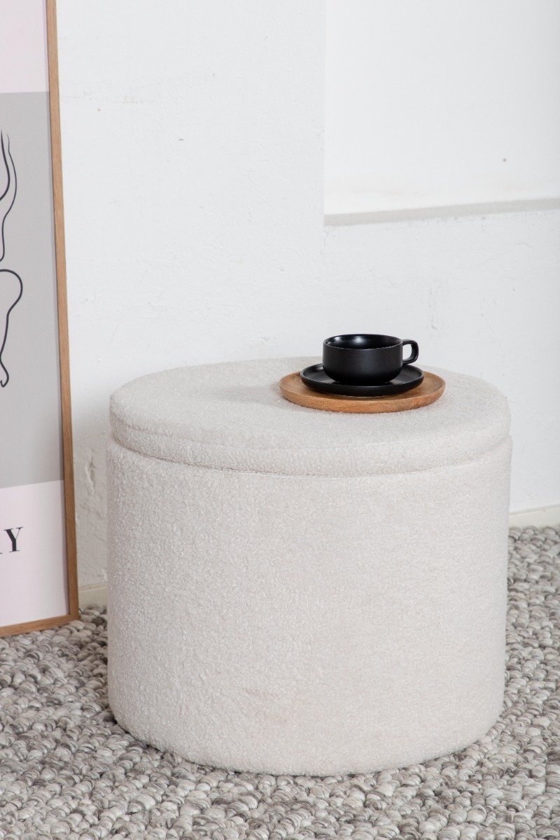 Elegant och funktionell sittpuff i vitt teddytyg med dolda förvaringsmöjligheter. Perfekt för extra sittplats och hemtrevlig komfort i alla rum.