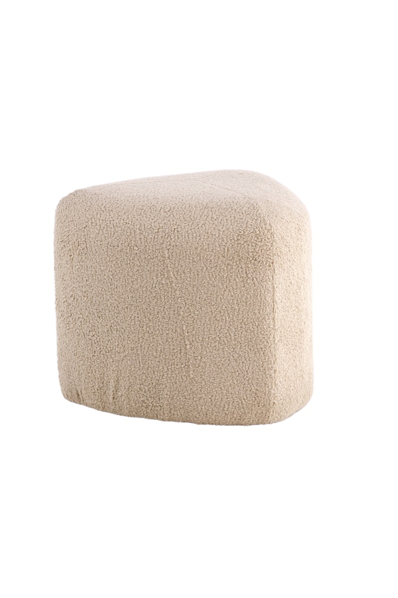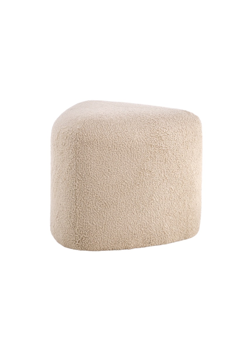 Mjukt beige triangelformad sittpuff i teddytyg – perfekt som fotpall eller extra sittplats med trendig design. Skapar en varm och inbjudande atmosfär i ditt hem.