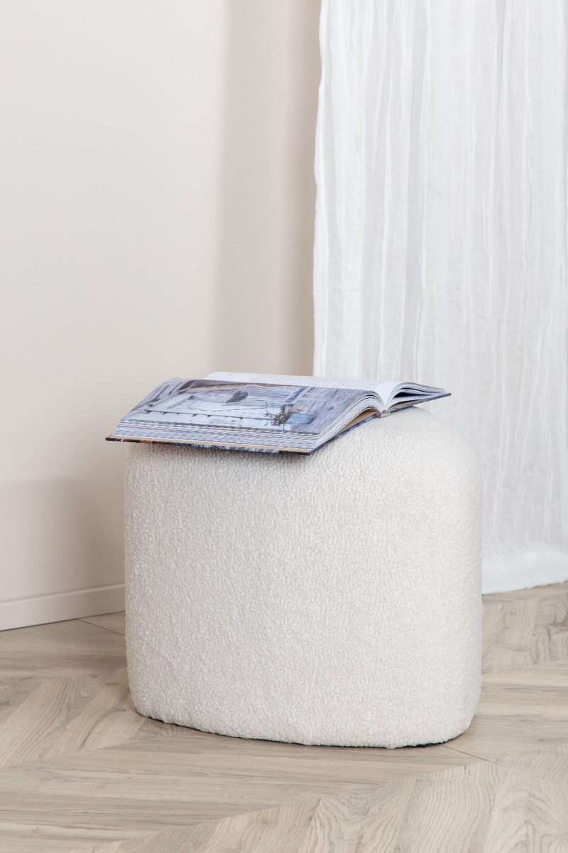 Denna triangulära teddypuff förenar form och funktion för ditt hem. Med sitt mjuka material och tidlösa vita nyans blir den både en stilfull inredningsdetalj och ett praktiskt tillskott. Lätt att matcha med övrig inredning och lättskött, vilket gör den idealisk för vardagsrum, sovrum eller loungeytor. Puffen rengörs enkelt med en fuktig trasa för att behålla sin mysiga finish och fräscha look. Skapa en behaglig atmosfär och lägg till extra komfort i ditt hem med denna charmiga teddypuff.