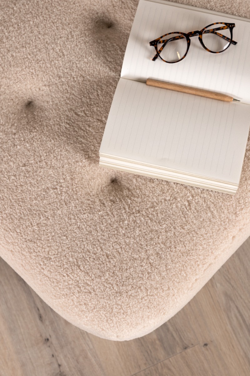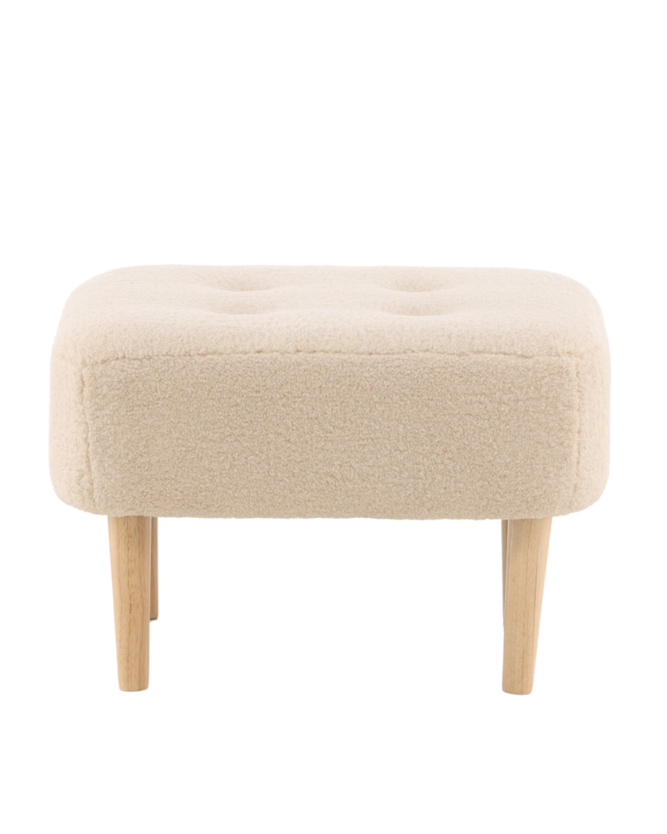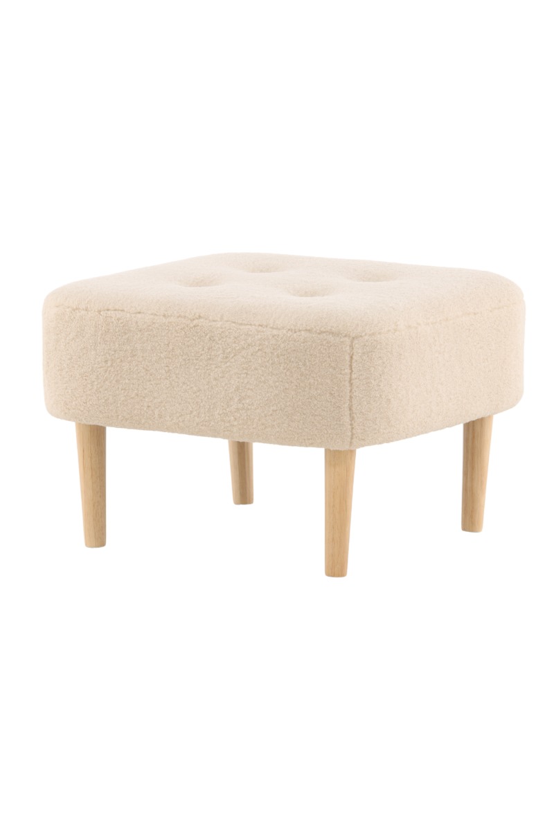 Stilren vit sittpuff i mjukt fleecetyg med träben som skapar både komfort och elegans. Perfekt för en varm och modern inredning.