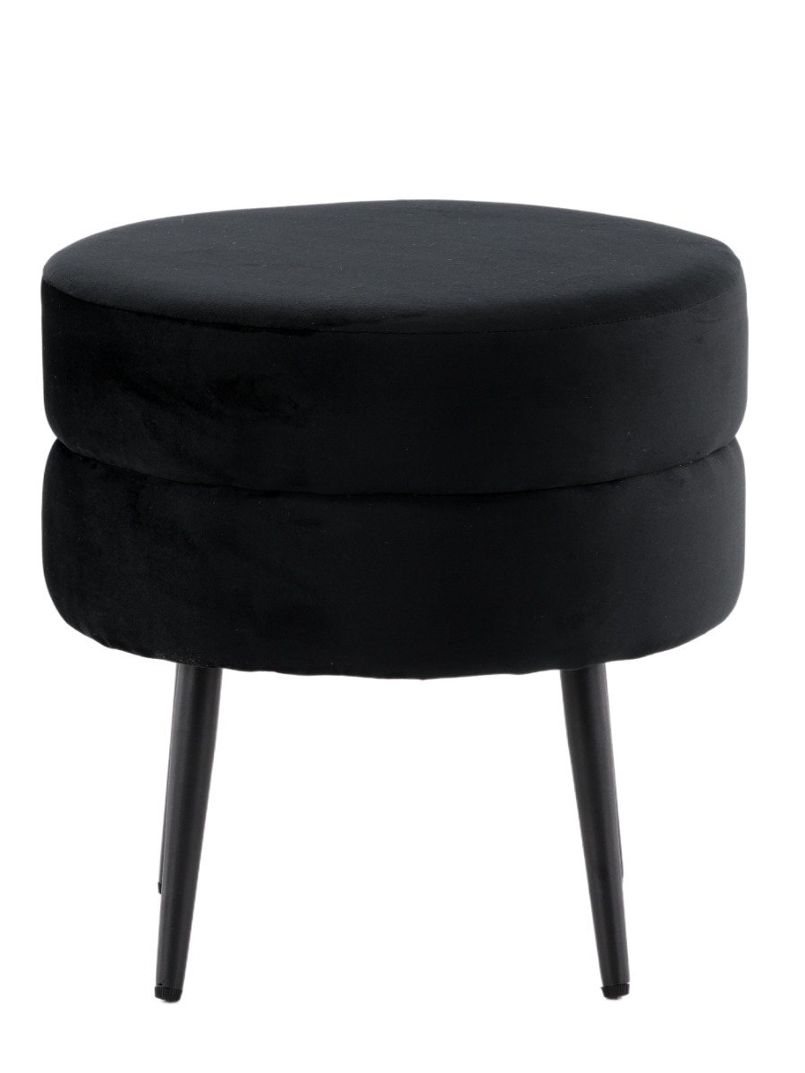 Svart sammetssittpuff med elegant design och praktiska mått. Perfekt som fotpall eller extra sittplats i stilfulla hem.