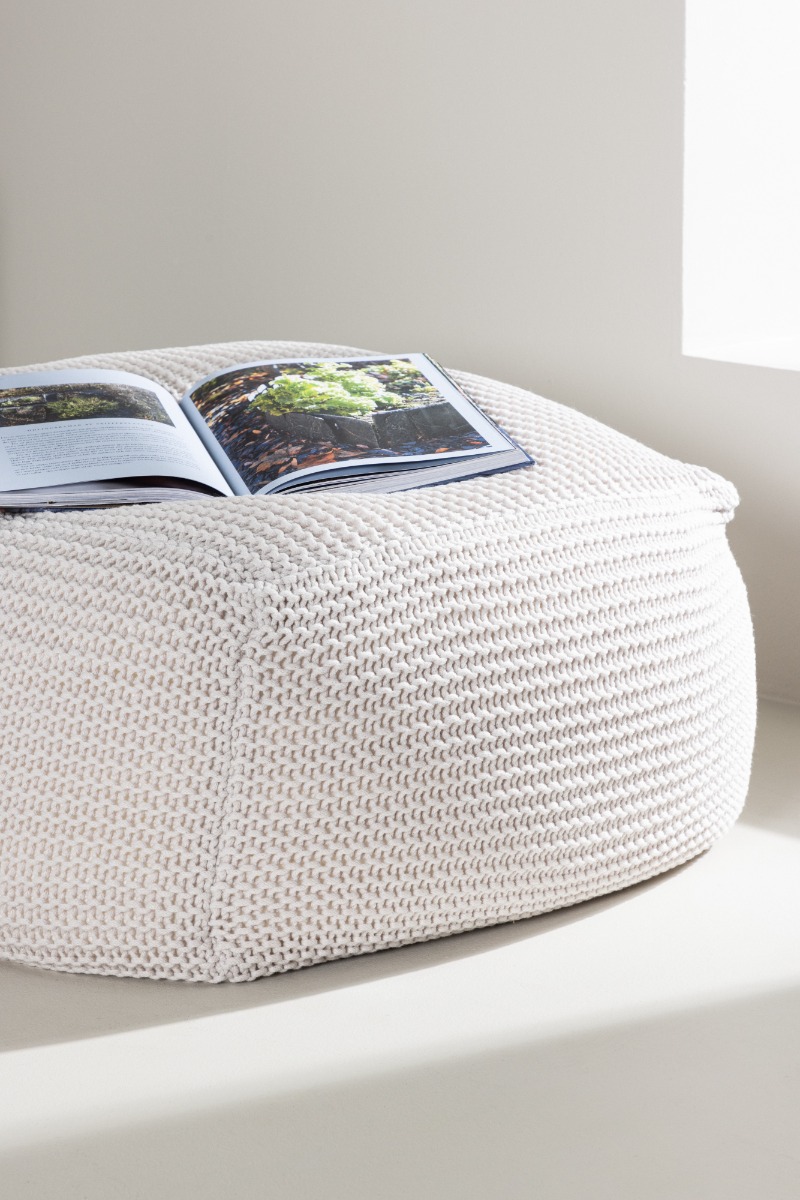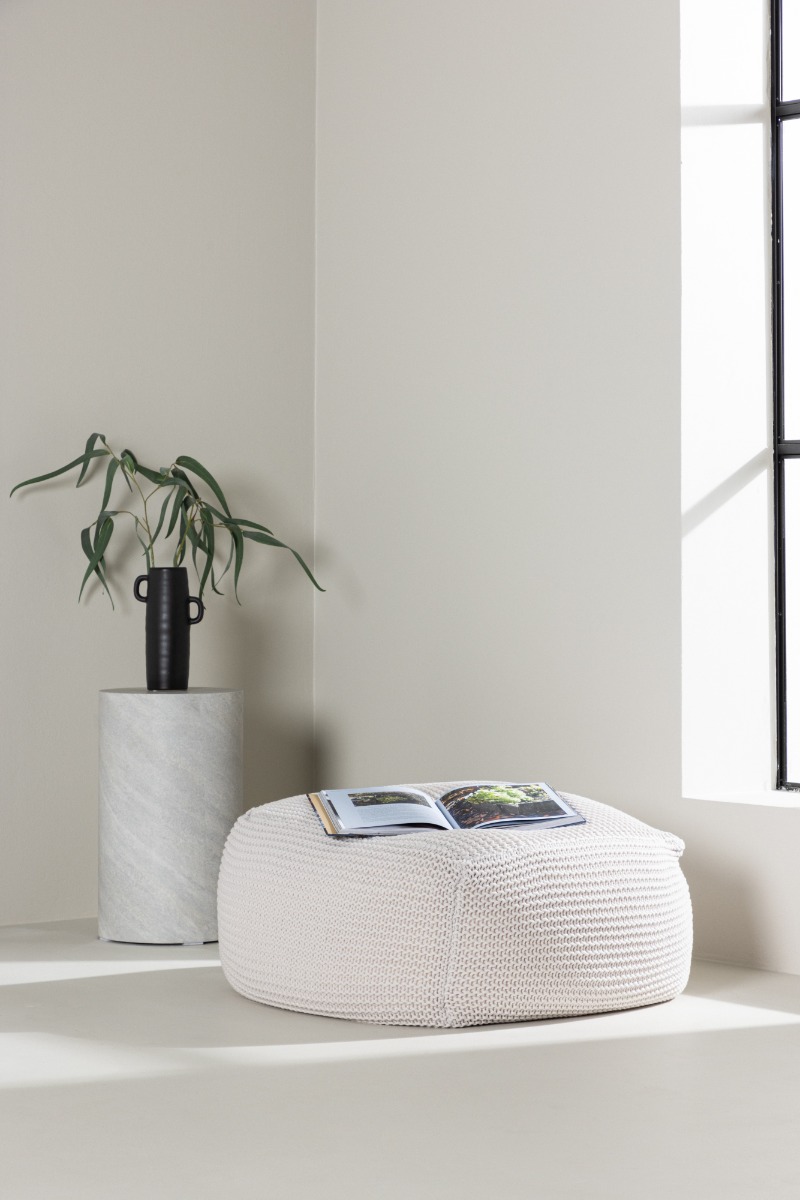 Krämfärgad sittpuff Korrivault kombinerar mjuk komfort med stilren design i storlek 60x60 cm. Perfekt som extra sittplats eller fotpall.