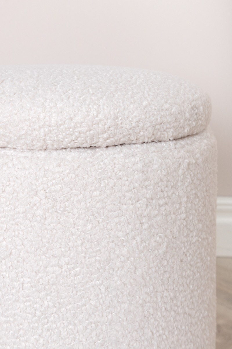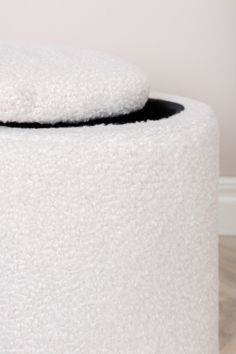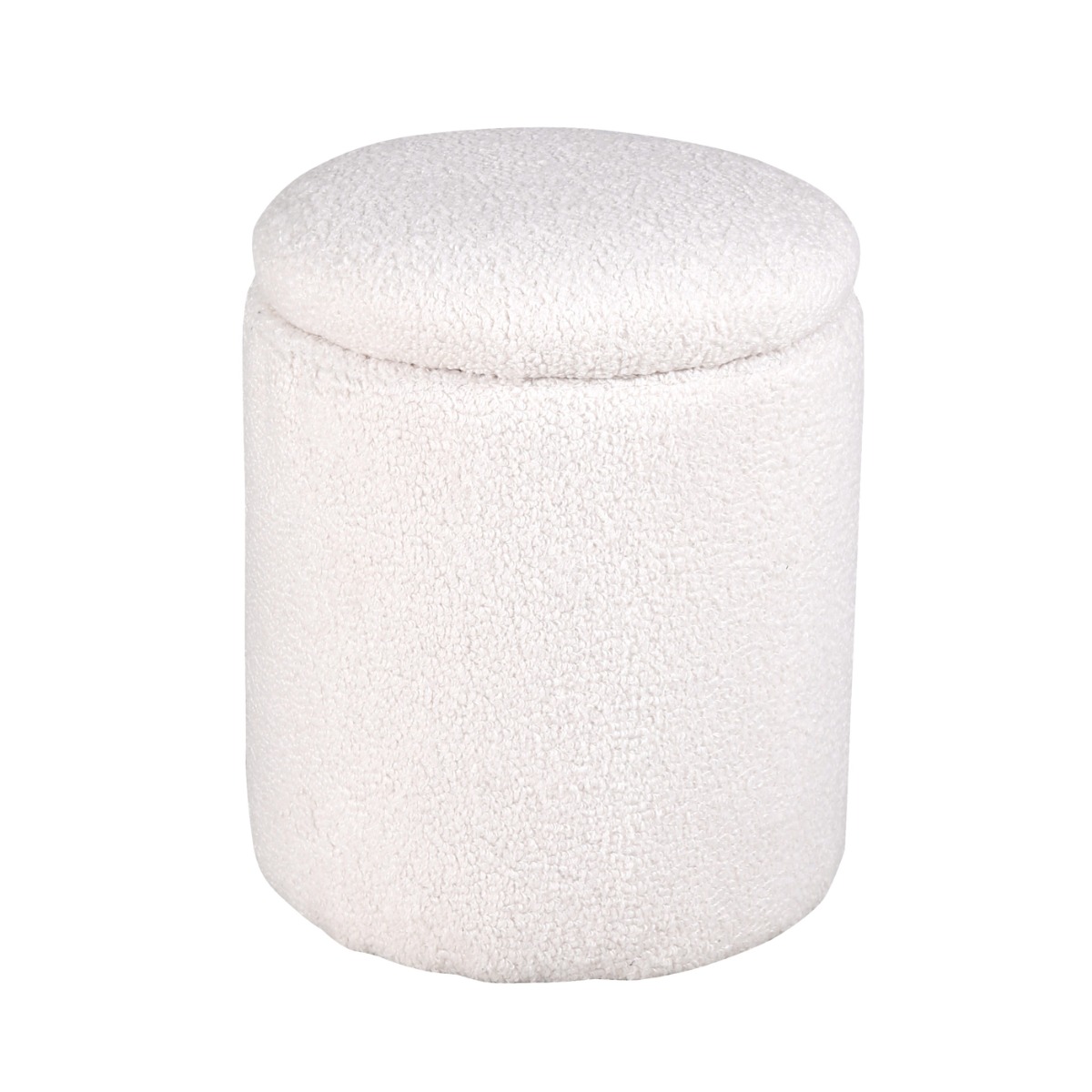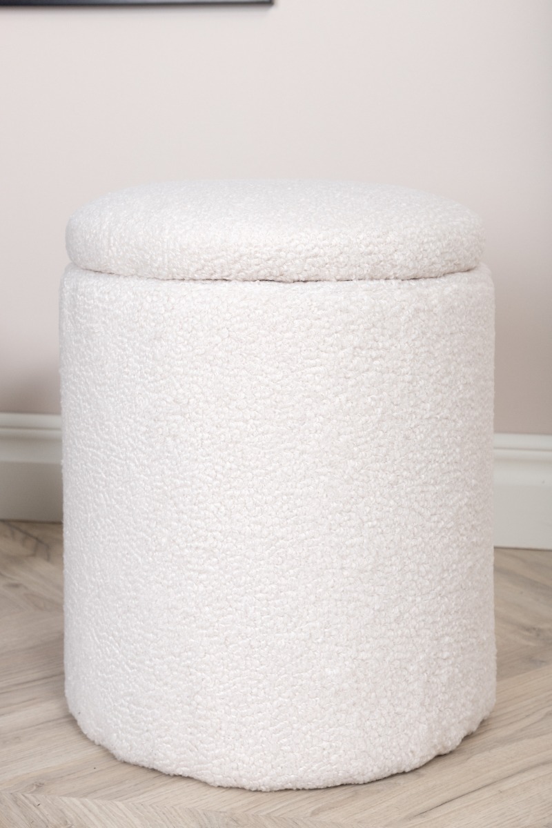 Vit sittpuff i mjukt teddytyg med smart förvaring och kompakt design. Perfekt som extra sittplats eller fotpall för en ombonad inredning.