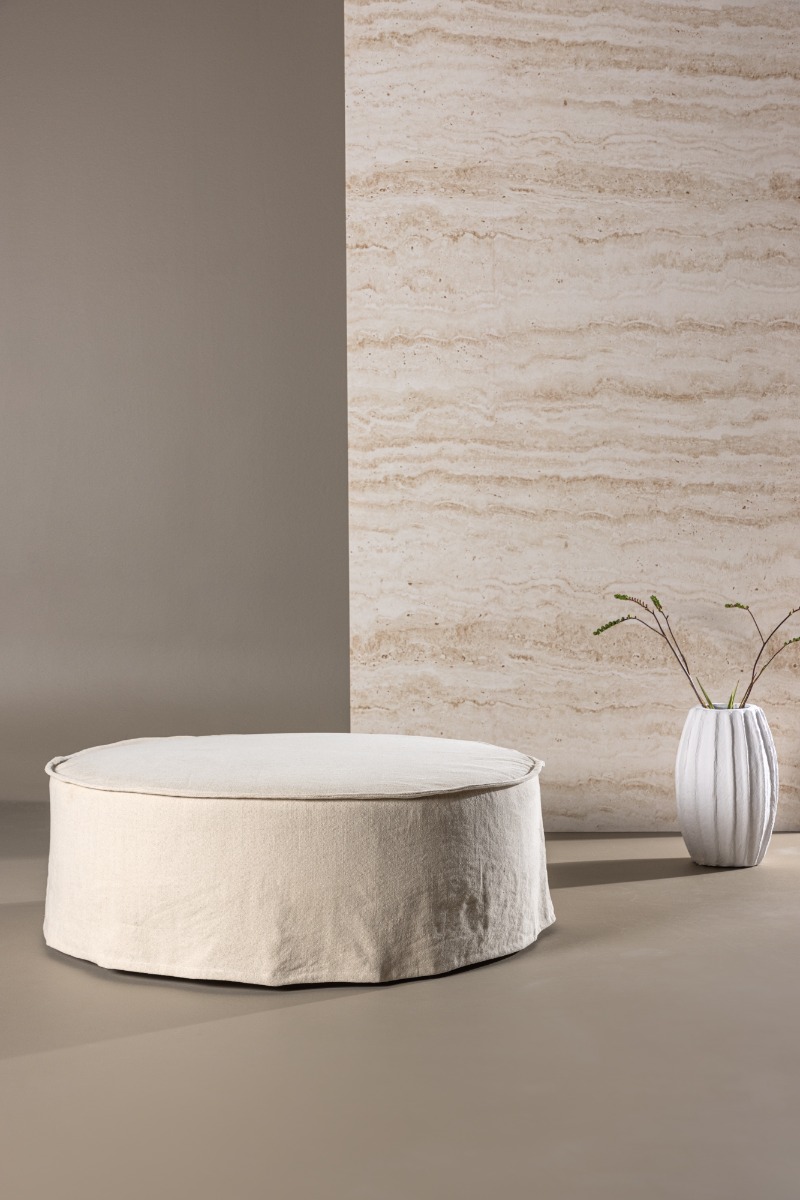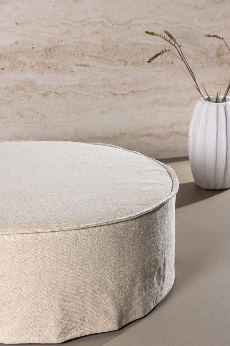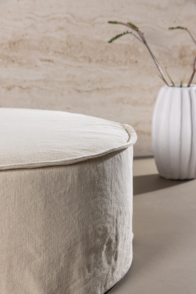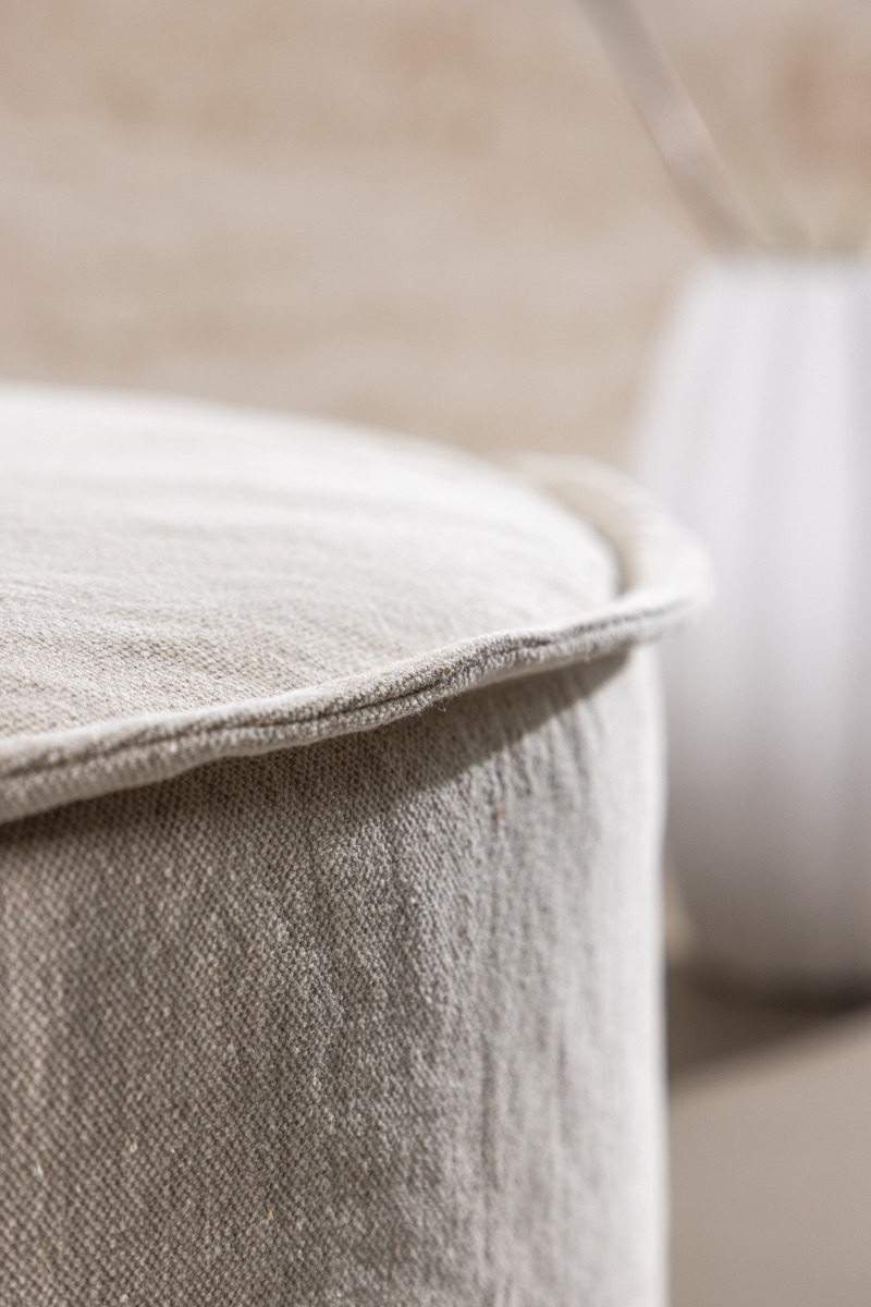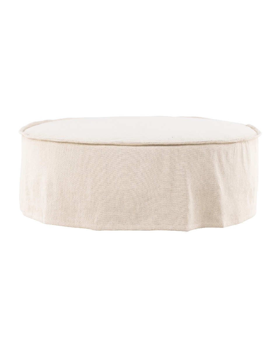 Stilren och bekväm sittpuff i linne med rund design. Lunverra Beige passar både som extra sittplats och fotpall i hemmet.