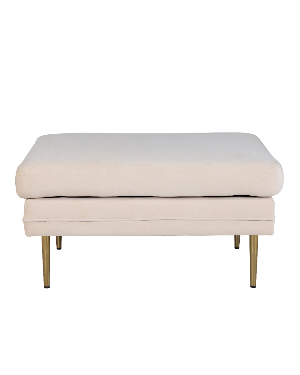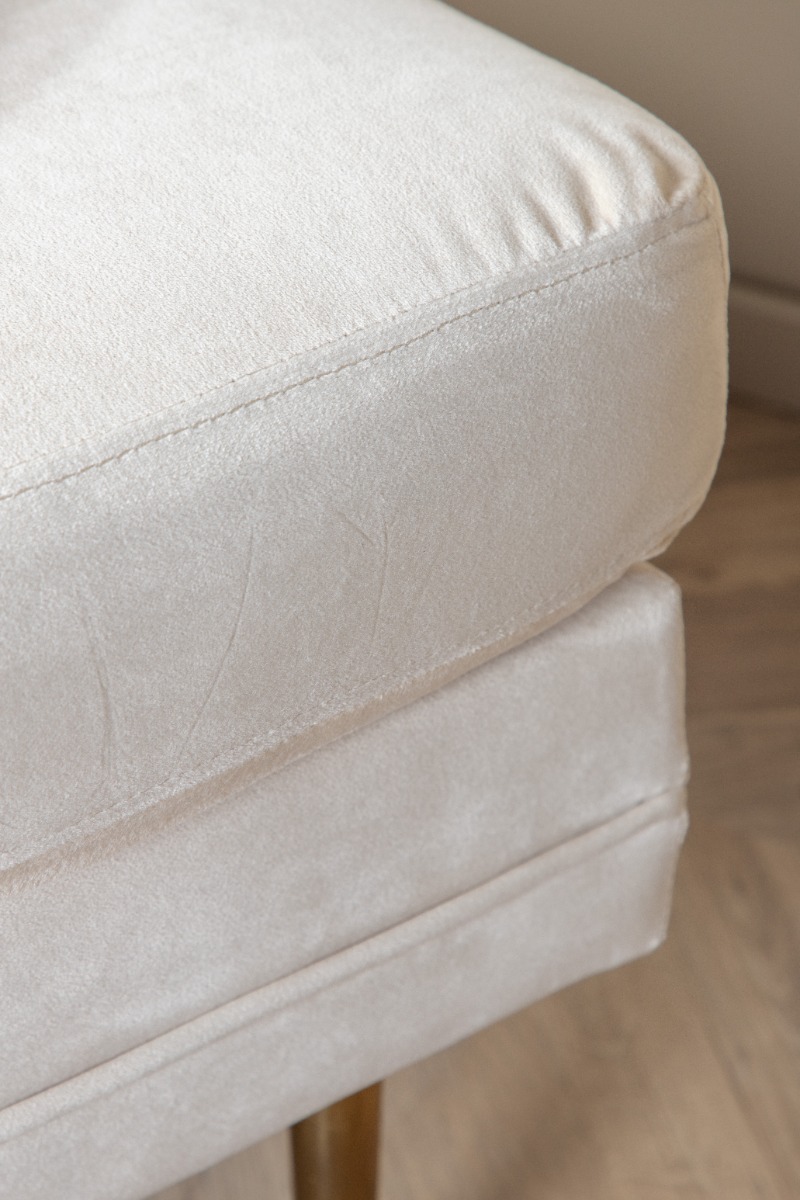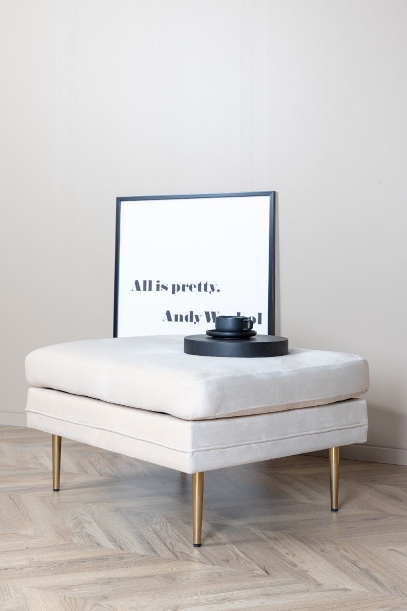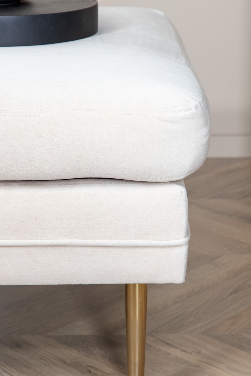 Stilren vit sittpuff i sammet med luftiga mässingsfärgade ben. Perfekt som bekväm extra sittplats eller fotstöd i nordisk design.