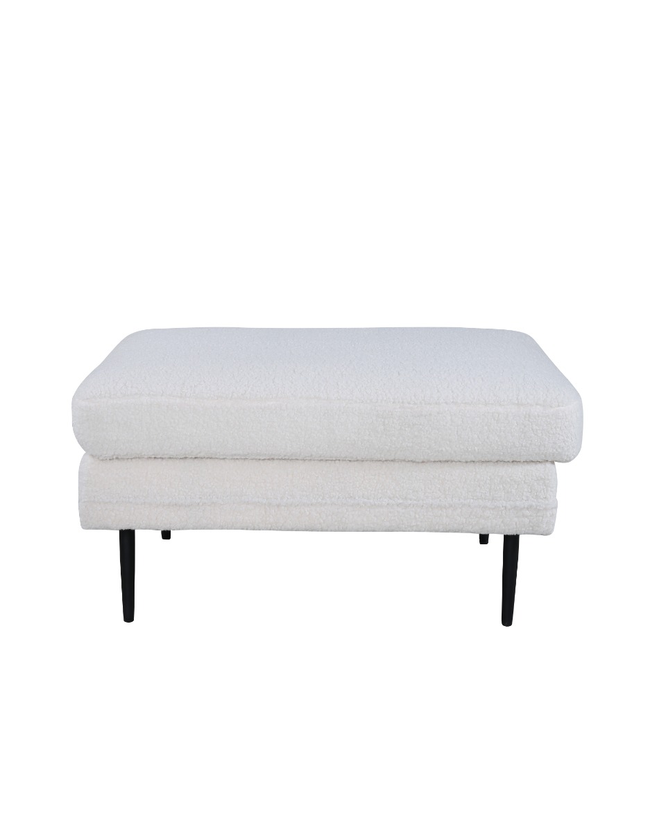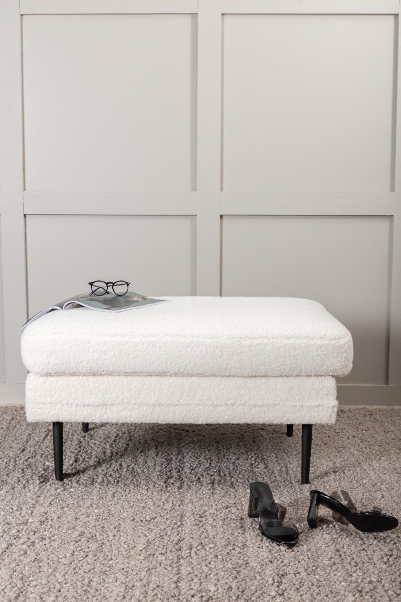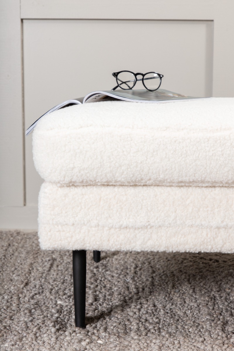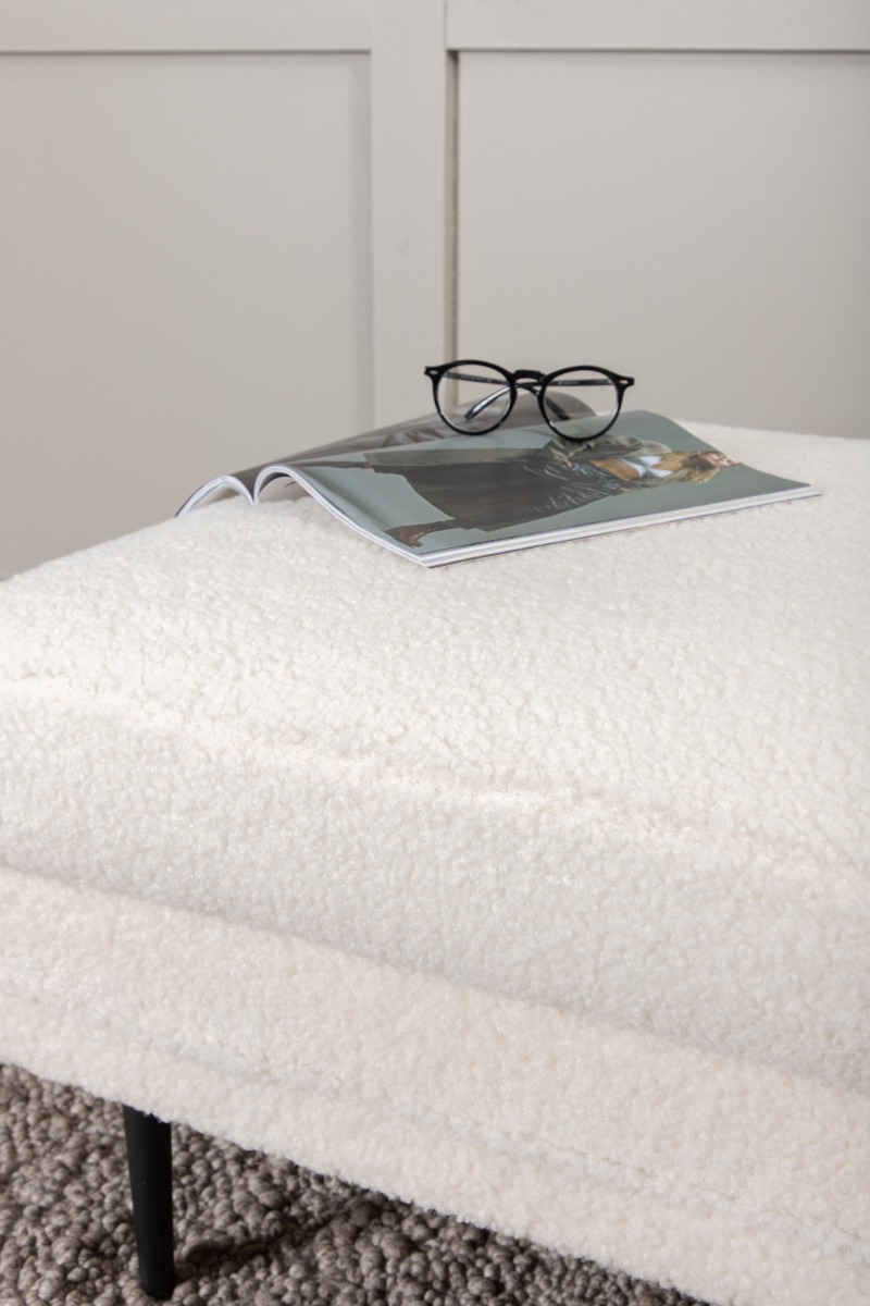 Mjuk och stilren sittpuff i vit teddy med svarta metallben som skapar en lätt och modern känsla. Perfekt som extra sittplats eller dekorativ detalj i hemmet.
