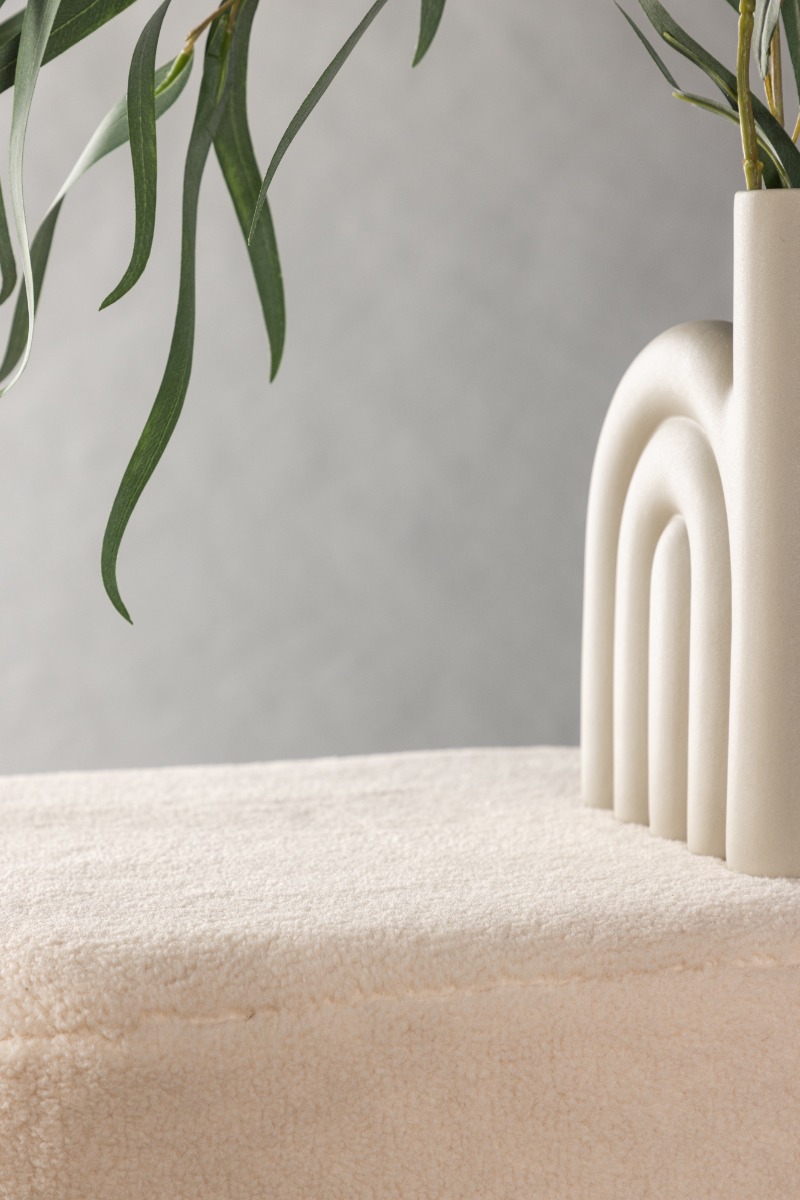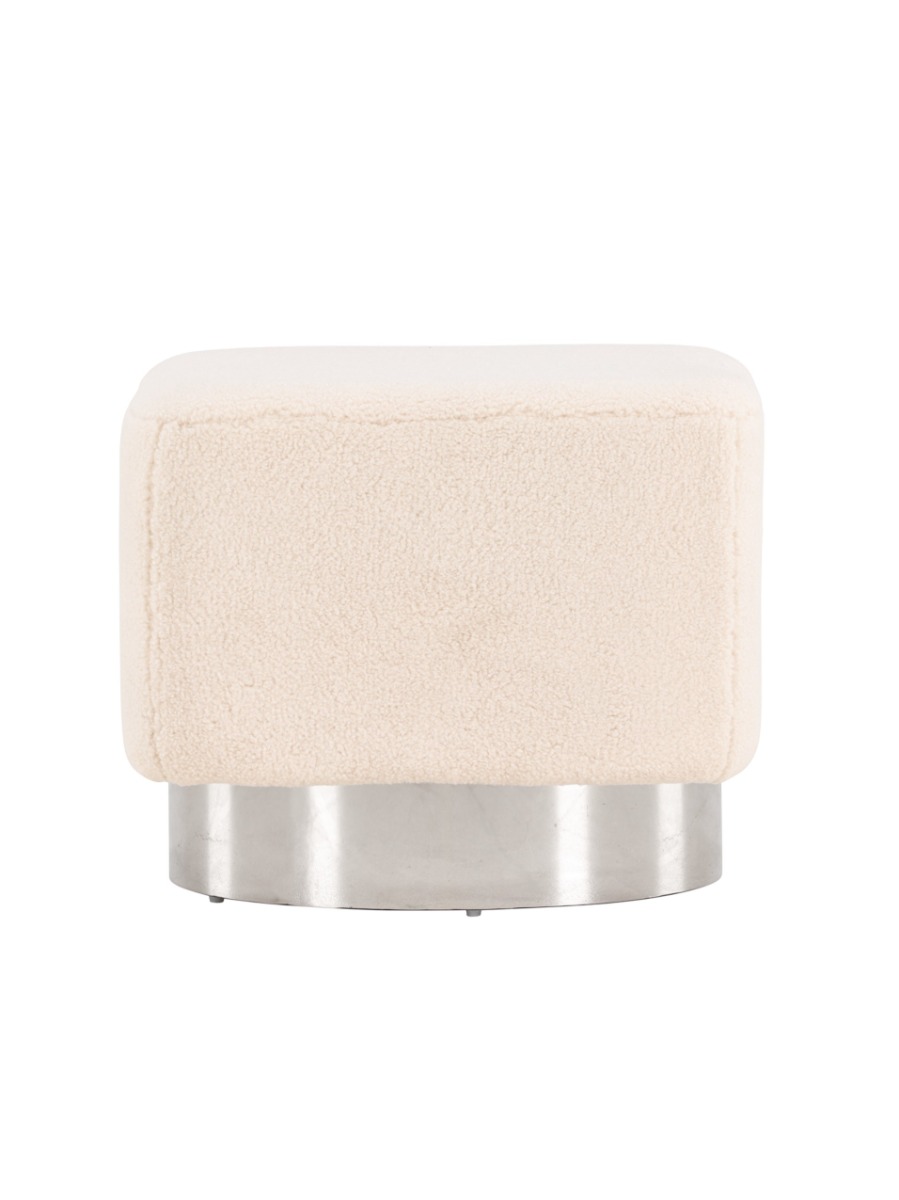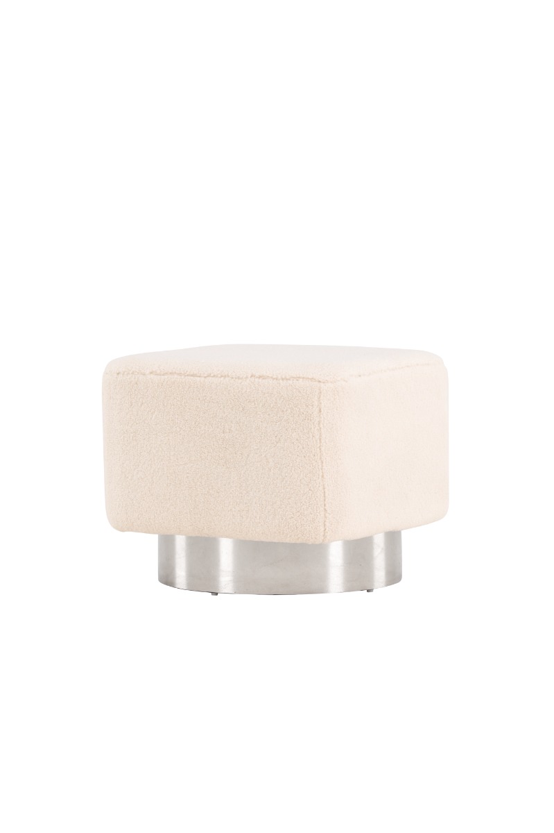 Mjuk sittpuff i offwhite fleece med elegant silverstomme. Perfekt som sitt- eller fotpall för extra komfort och stil i ditt hem.