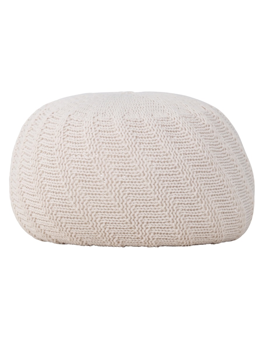 Mjuk och elegant rund sittpuff i offwhite polyester. Perfekt som extra sittplats eller fotpall, lättplacerad och stilren för alla rum.
