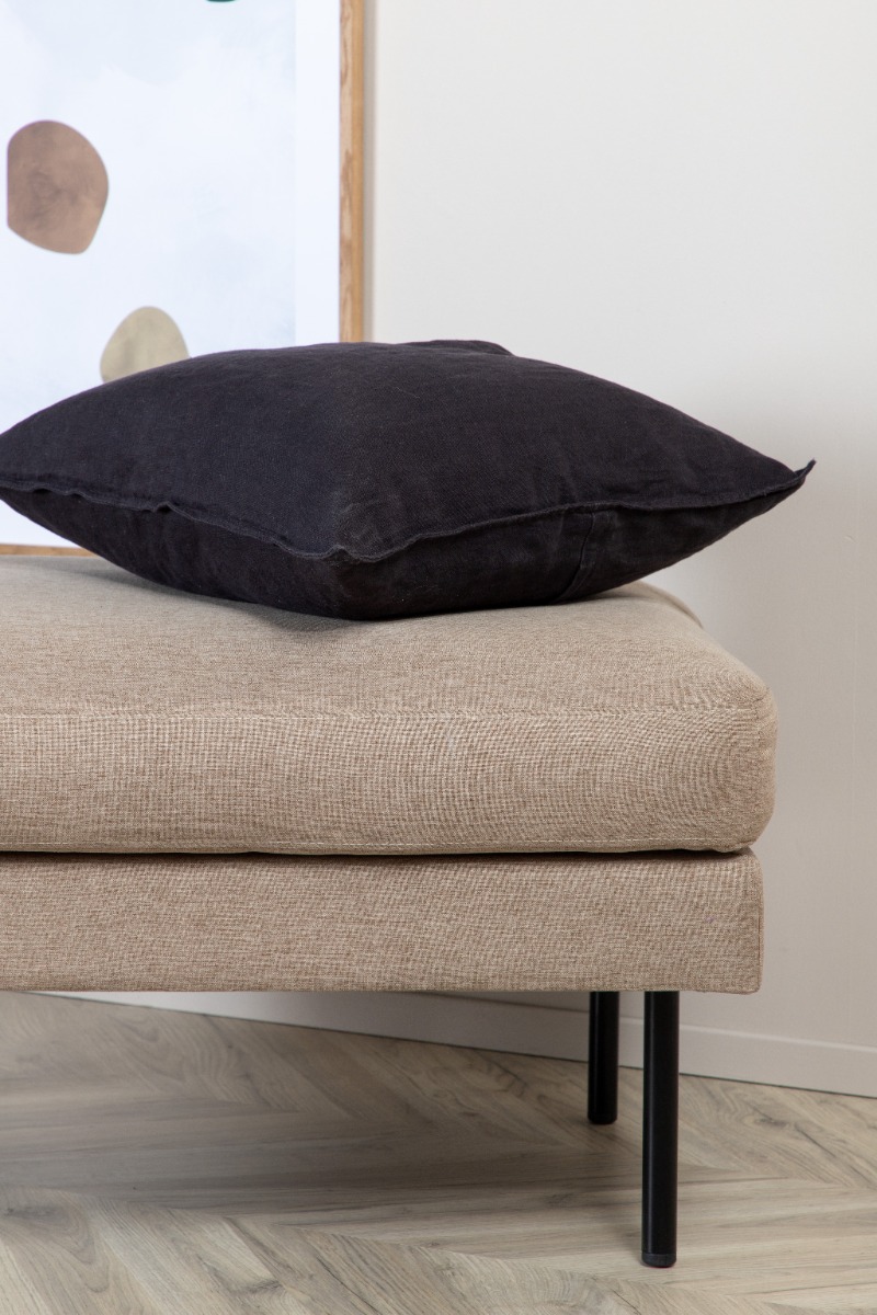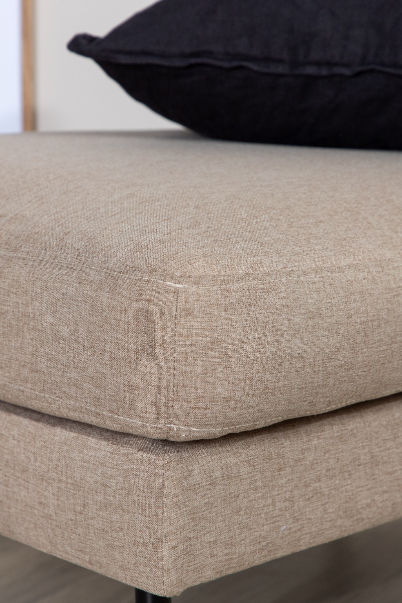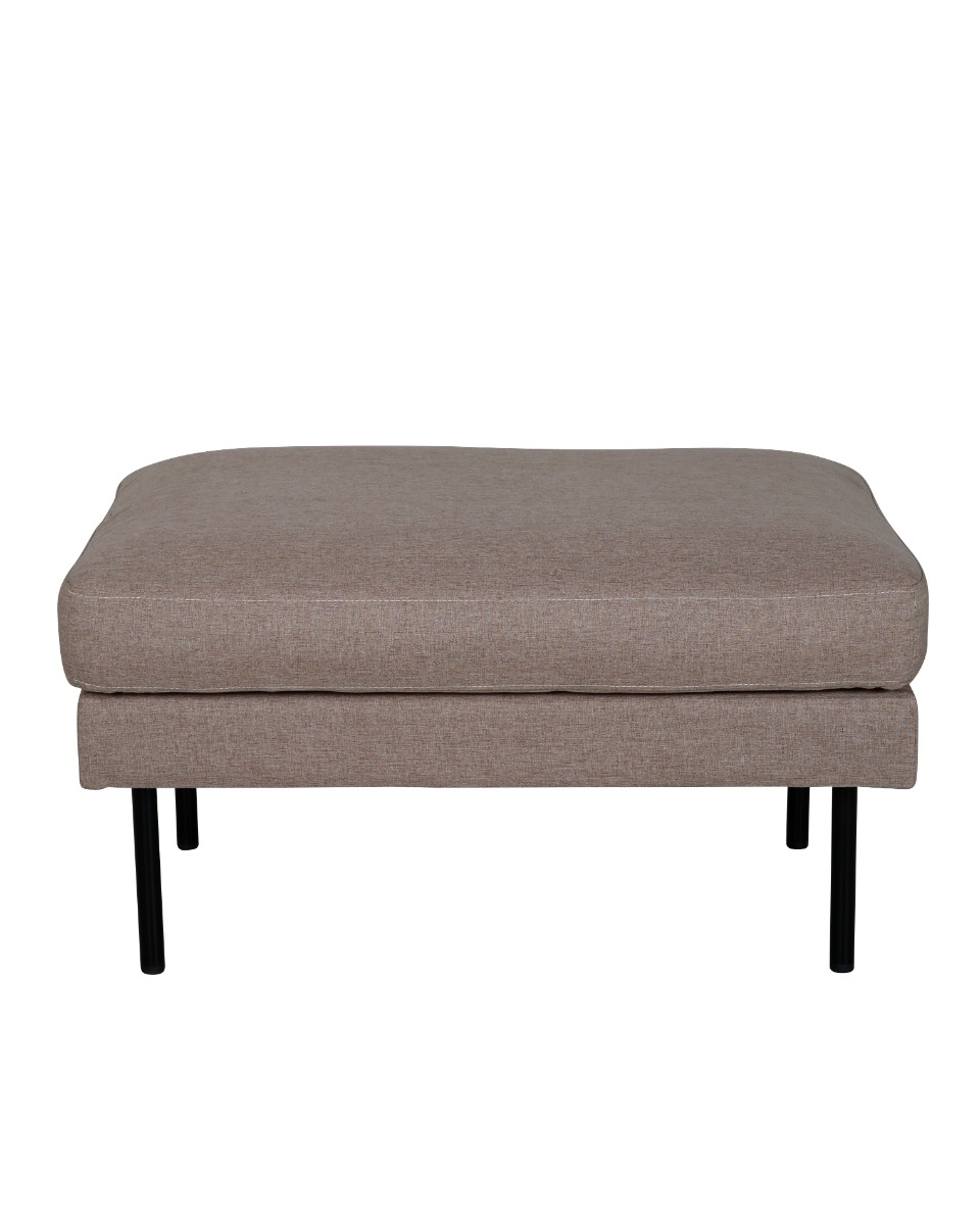 Stilren sittpuff i brun polyesterväv med trä- och metallram som erbjuder både komfort och hållbarhet. Perfekt för ett elegant och funktionellt tillskott till ditt hem.