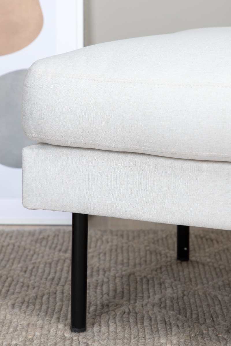 Modern och mjuk sittpuff i ljusbeige med robusta metallben och slitstarkt polyester. Perfekt som extra sittplats eller fotpall med elegant nordisk design.