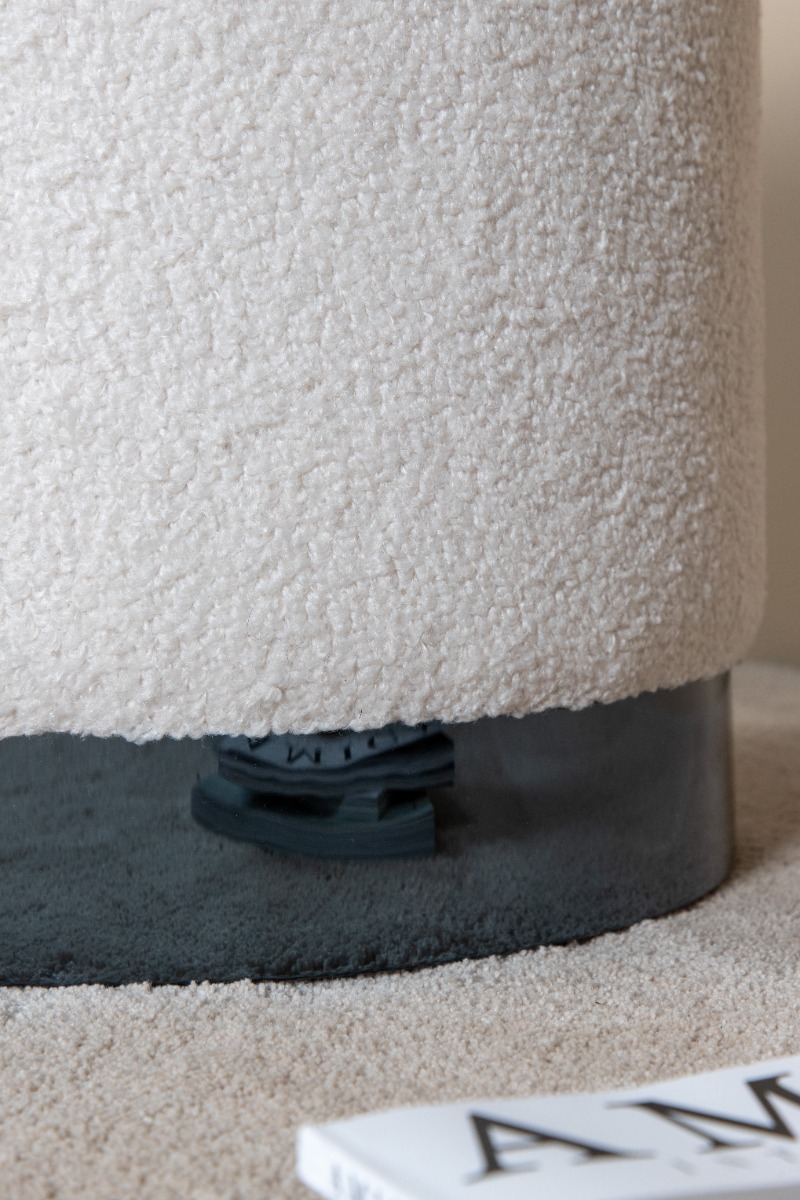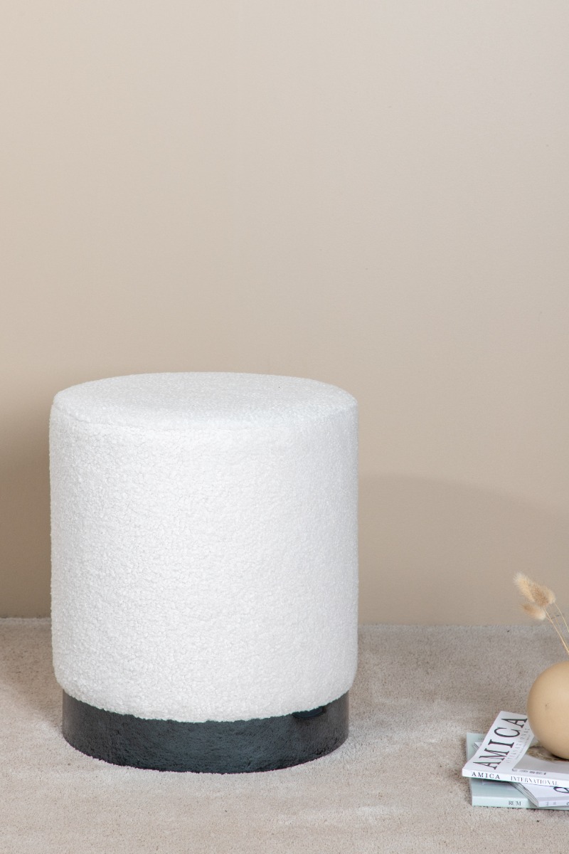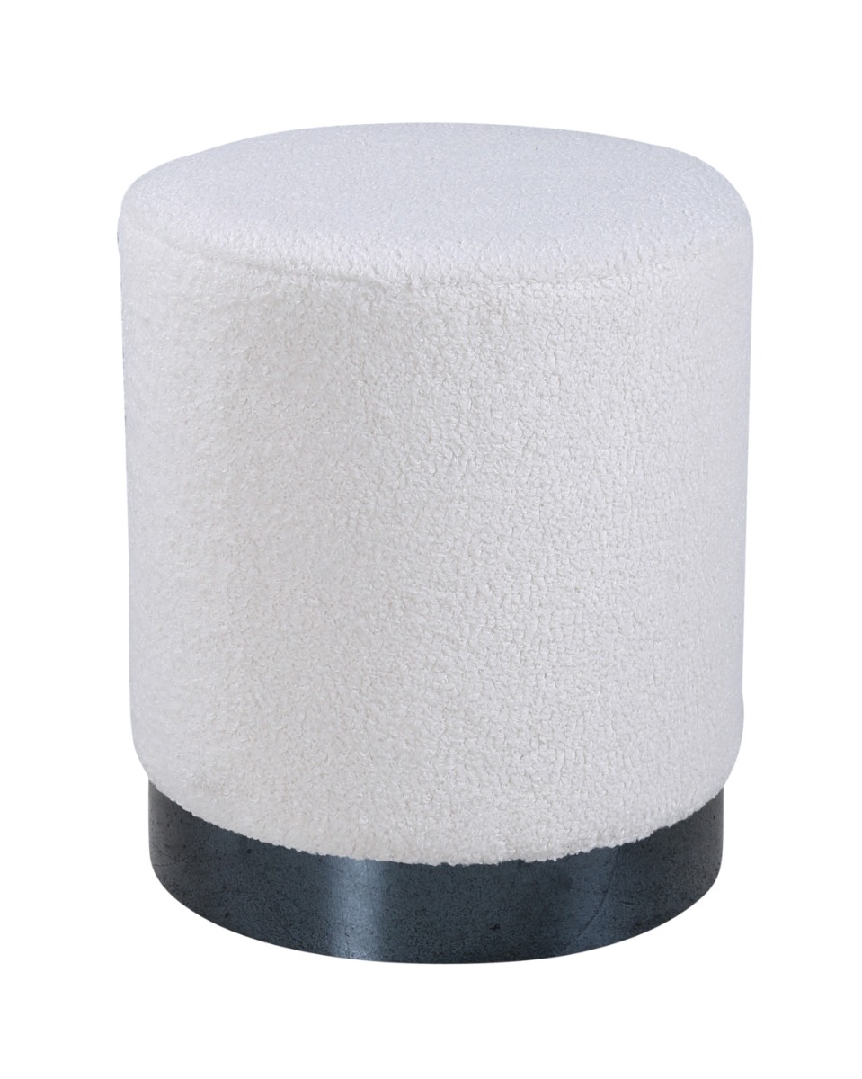 Mjuk och stilren vit sittpuff i teddytyg med svart metallbas. Perfekt som fotpall, extra sittplats eller dekorativ inredningsdetalj.
