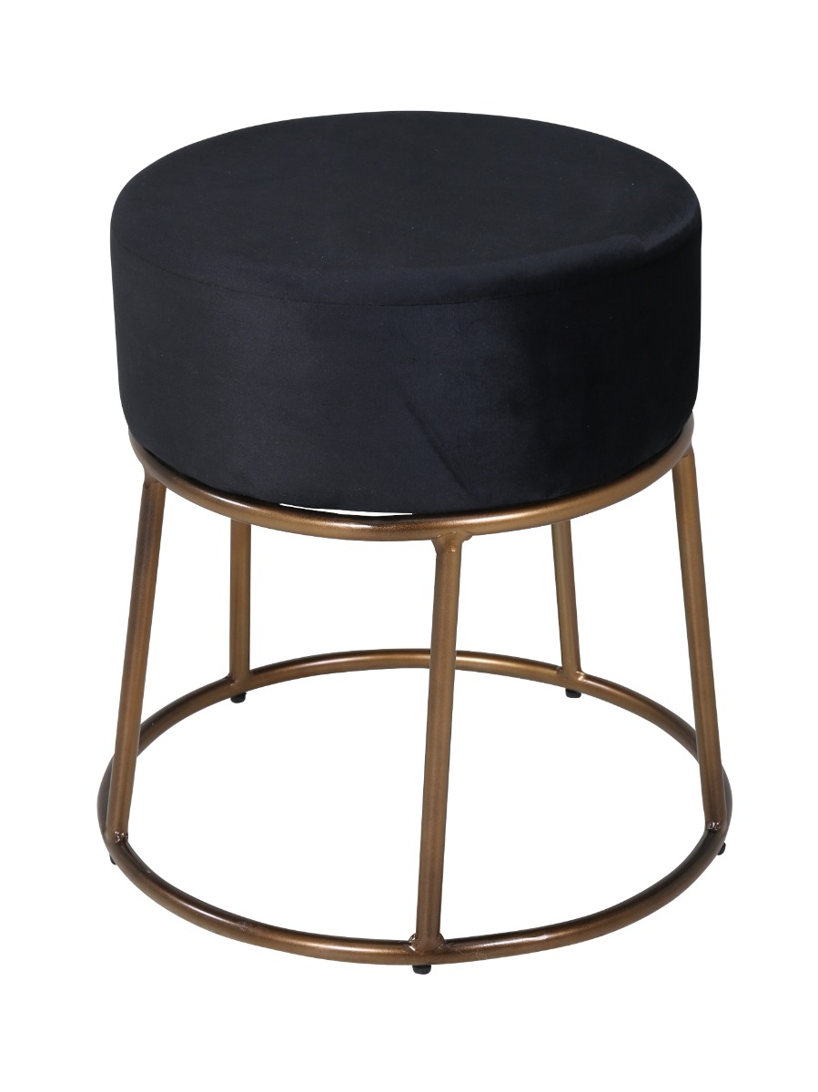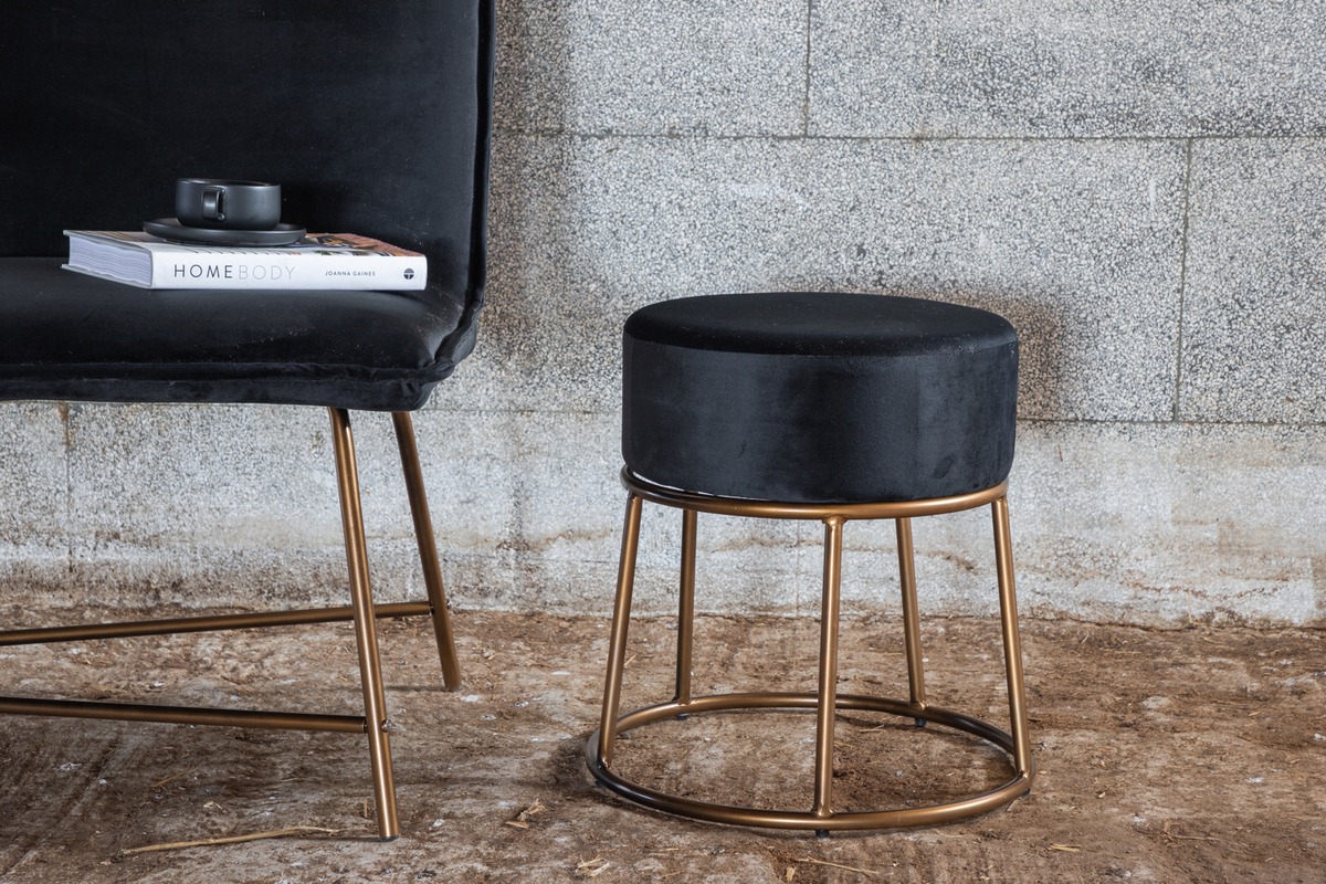 Exklusiv svart sittpuff i sammetslen design med elegant kopparstomme. Bekväm, kompakt och lättplacerad – perfekt som extra sittplats eller stilfull inredningsdetalj.
