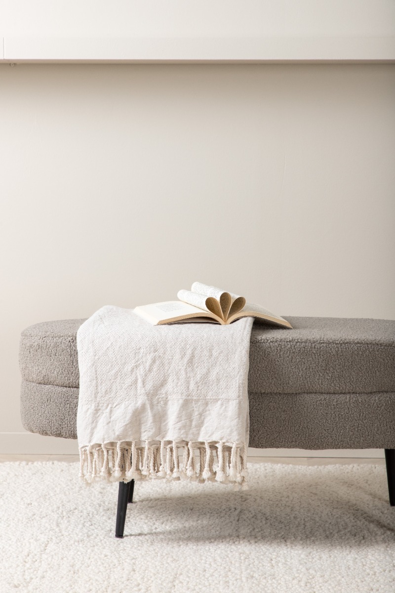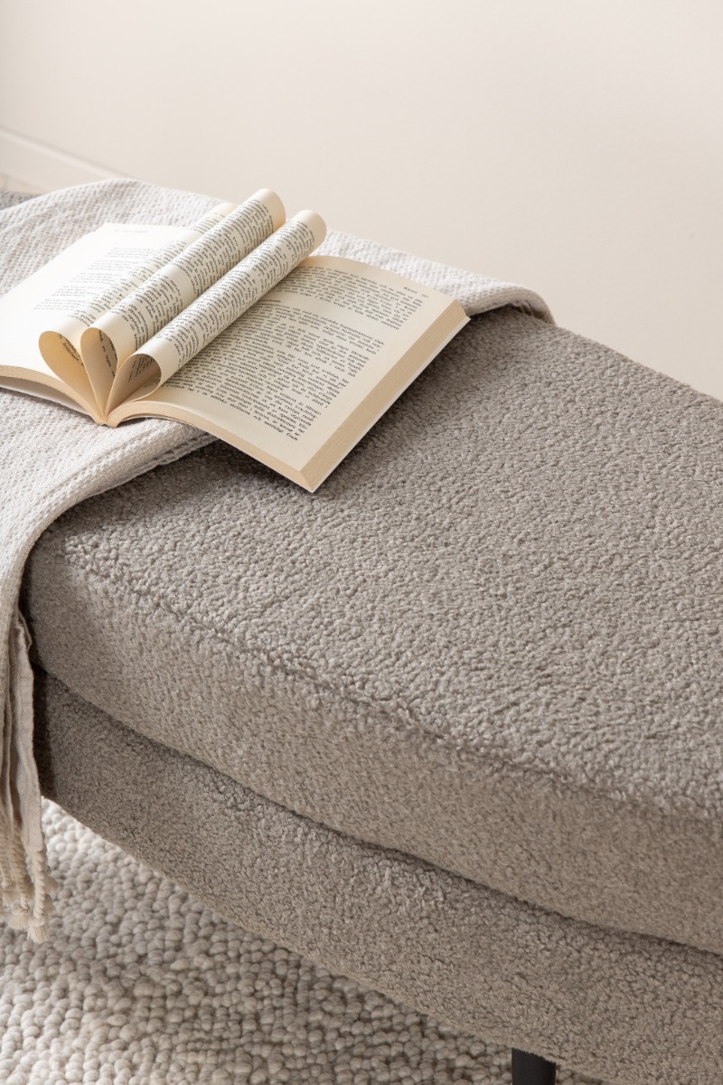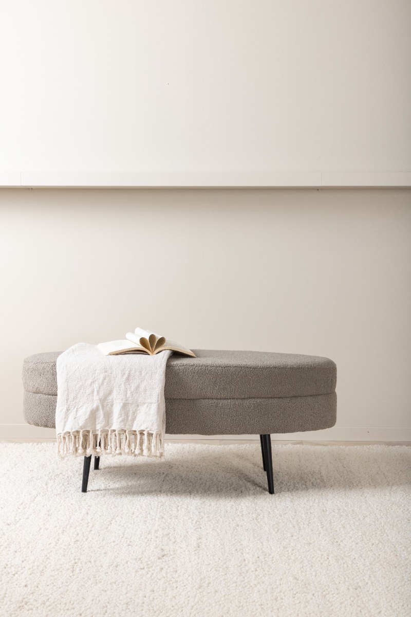 Den här sittpuffen kombinerar funktion och trendig estetik för att skapa ett varmt och inbjudande rum. Tack vare den neutrala greige färgen passar den smidigt in i både moderna och klassiska inredningar. Den ovalformade designen gör att puffen kan placeras både vid soffan, fotändan av sängen eller i hallen som en praktisk och dekorativ detalj. För att bevara den mjuka ytan rekommenderas fläckborttagning direkt med en fuktig trasa – undvik att gnugga. Vid svårare fläckar kan ett test på en dold del av tyget med fläckborttagningsmedel göras. En stilren sittpuff som höjer komforten och ger hemmet karaktär.