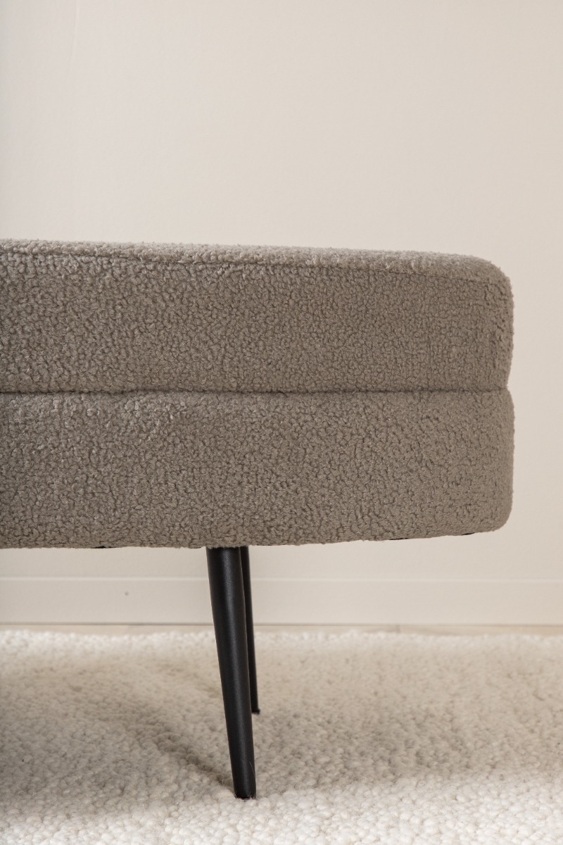 Oval sittpuff i mjukt greige teddytyg och svarta stålben som tillför både komfort och modern stil till ditt hem. Perfekt som extra sittplats eller fotpall.