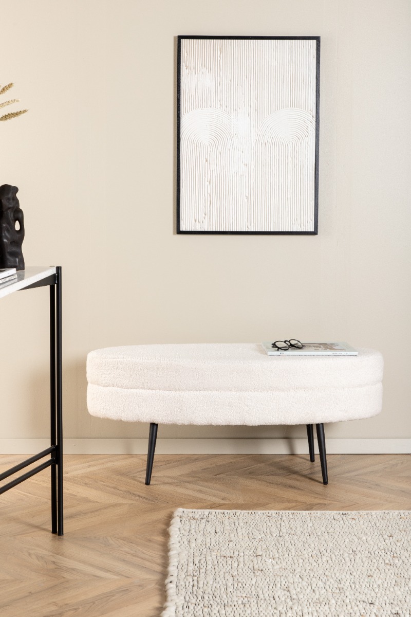 Oval sittpuff i mjukt vitt teddytyg med svarta metallben. Perfekt som extra sittplats, fotpall eller avlastningsyta i moderna hem.