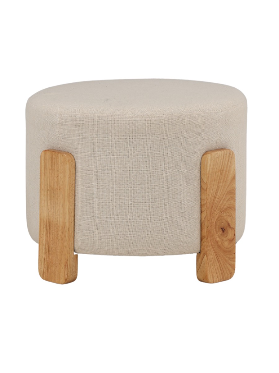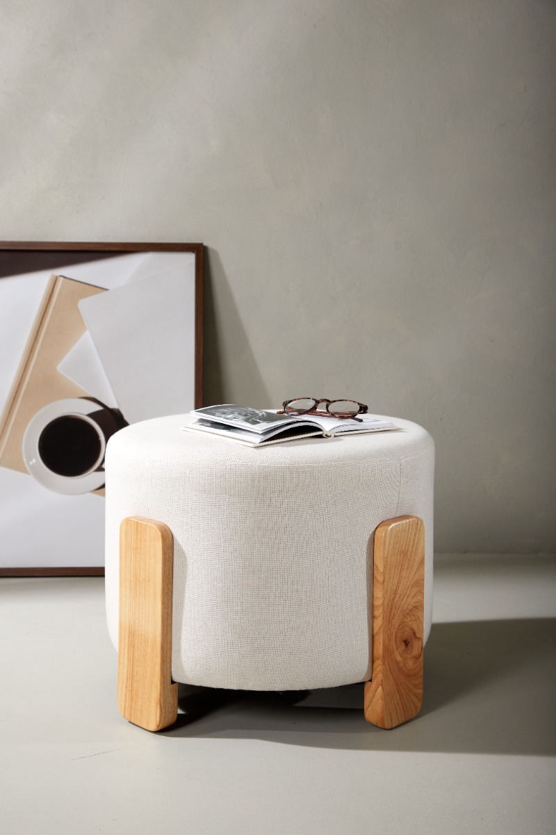 Stilren vit sittpuff i slitstarkt linne och trä. Perfekt som fotpall eller extra sittplats med en tidlös och mångsidig design.