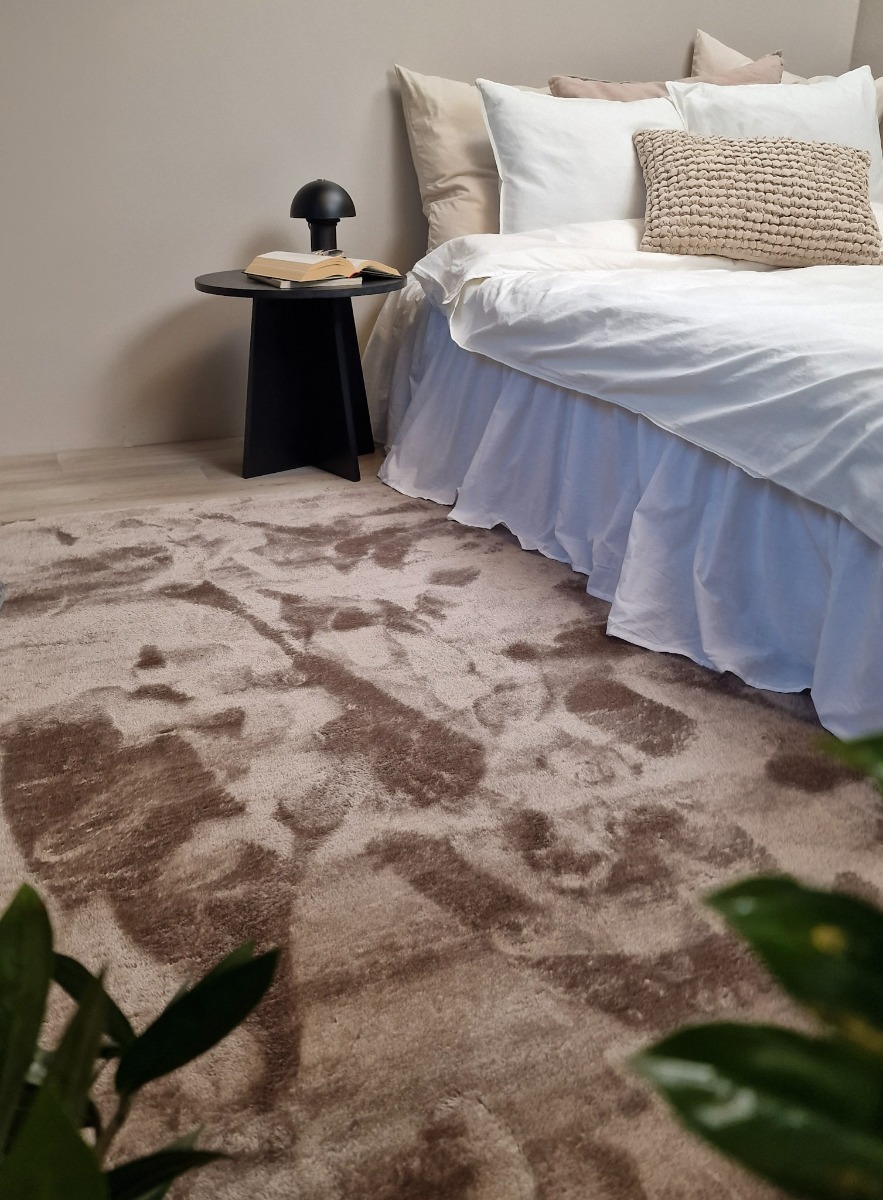 Terri Taupe Ryamatta ger ditt rum en elegant och varm känsla med sin mjuka, skinande lugg och halksäkra baksida. Perfekt för en ombonad och stilren inredning.
