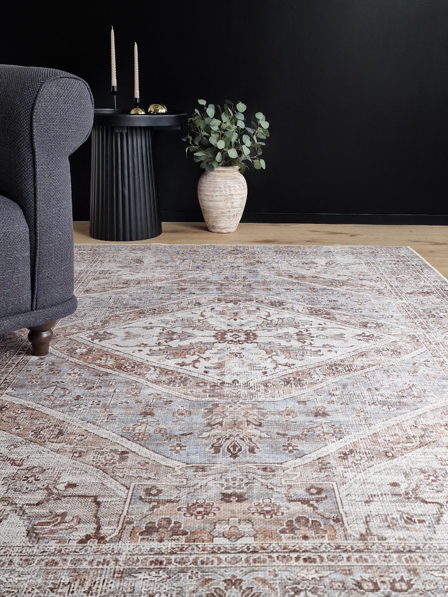 Tvättbar bomullsmatta i kräm och blå med mjuk känsla och miljövänlig design. Perfekt för moderna hem som vill kombinera stil och enkel rengöring.