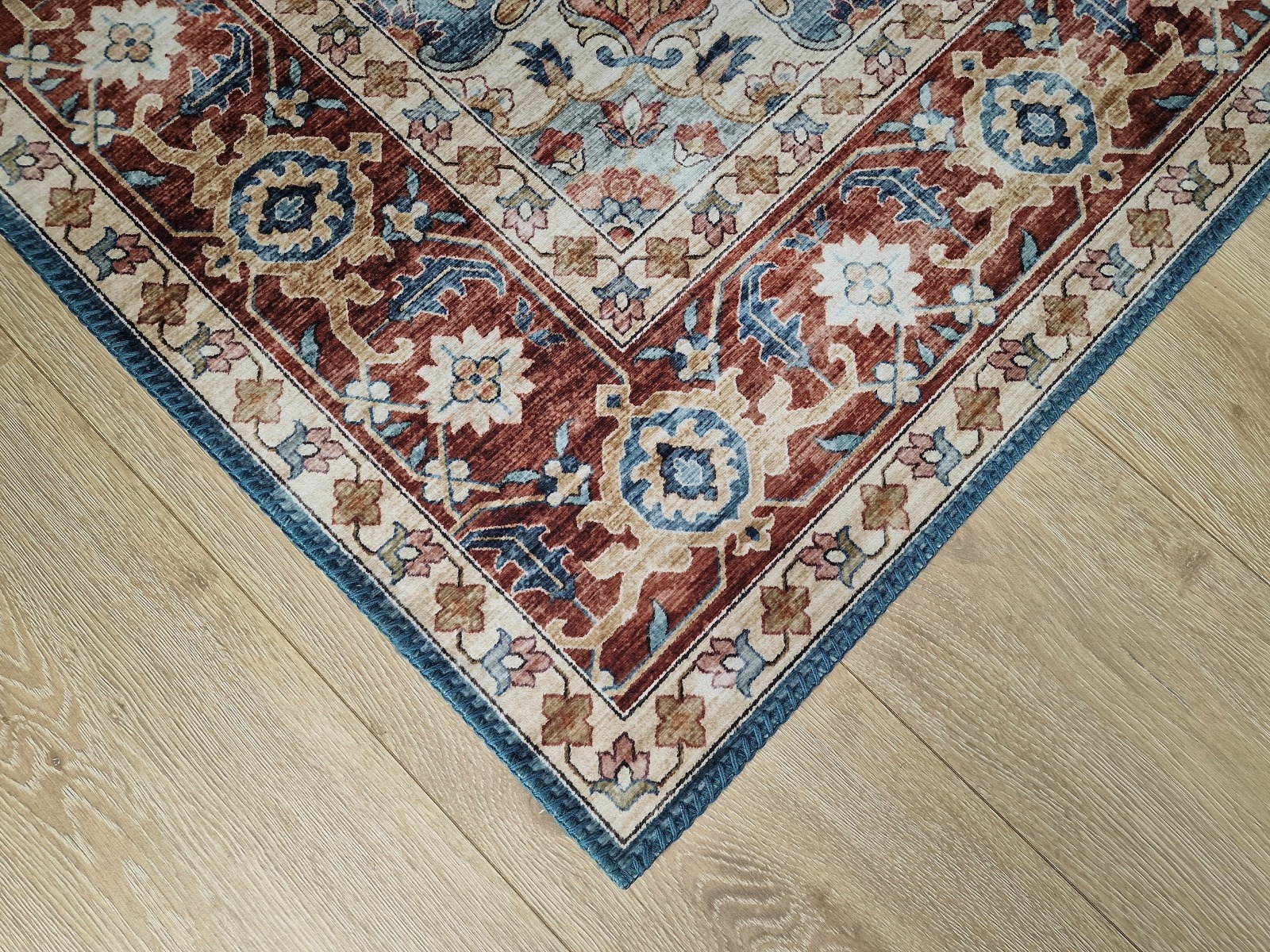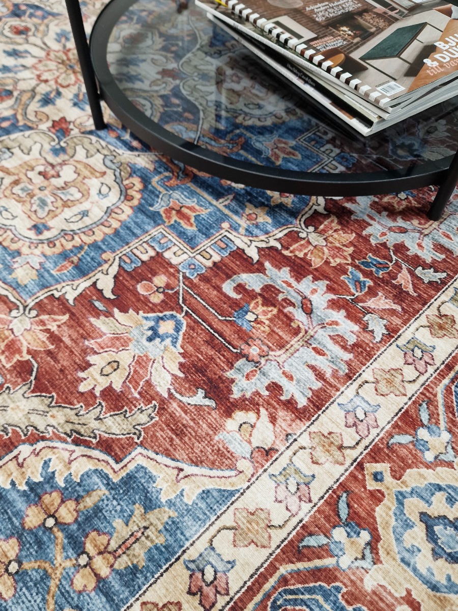 Elegant och hållbar tvättbar matta med livfullt rött mönster. Låg profil och halkfri baksida gör den säkrad och lätt att rengöra i maskin.