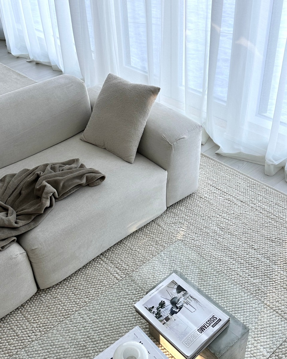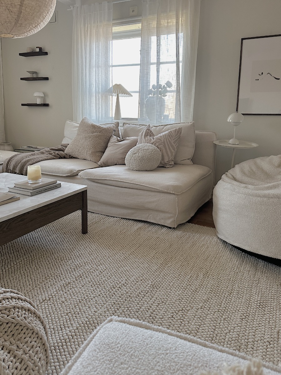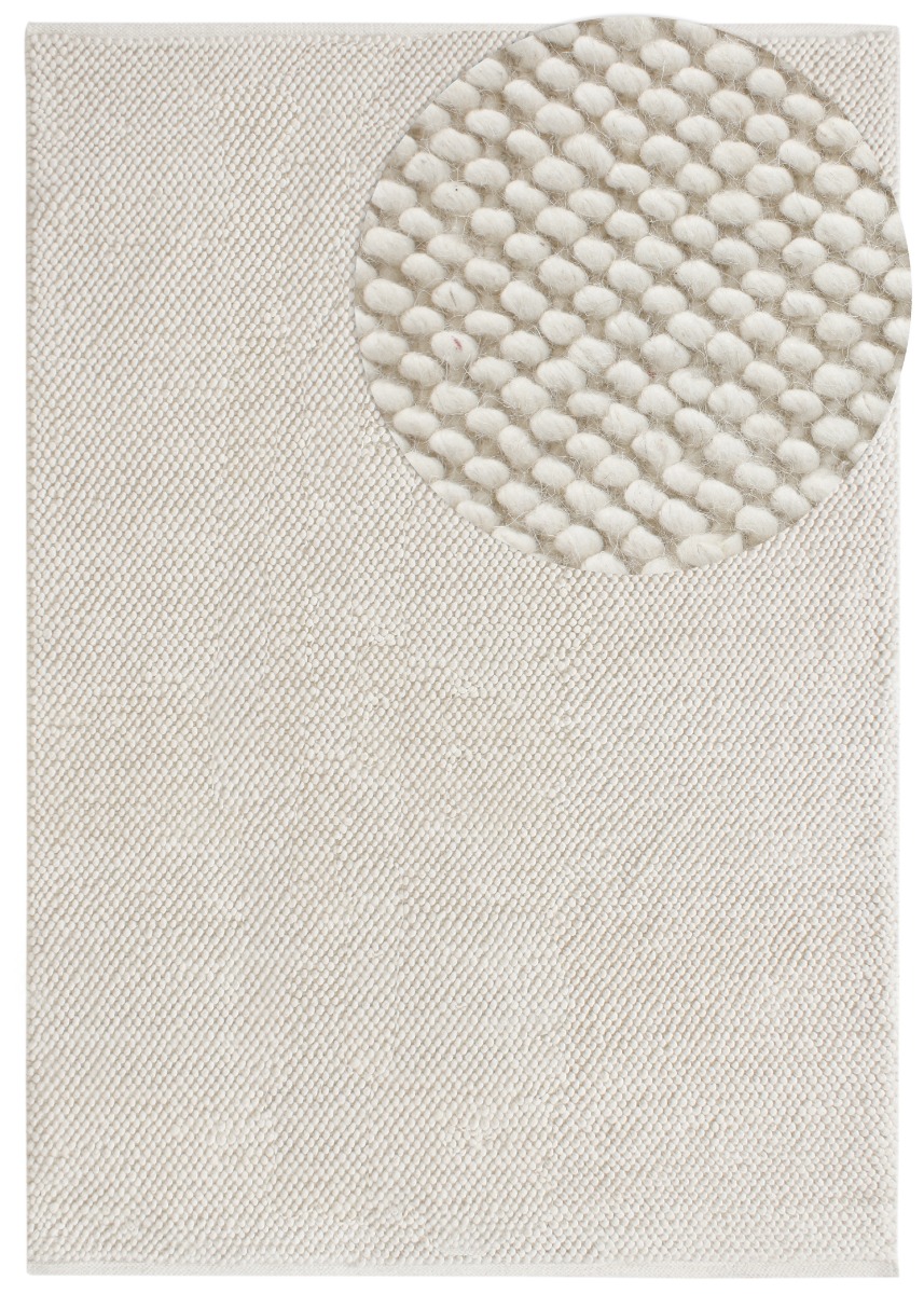 Ljus ullmatta i offwhite med tjock, bubblig yta som skapar värme och stil i ditt hem. Hållbar och mjuk för vardagsrum och sovrum.