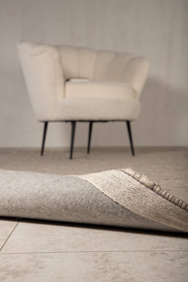 Elegant beige ullmatta med cirka 20 mm tjocklek som ger värme och komfort i hemmet. Slitstark och naturligt mjuk för alla rum.