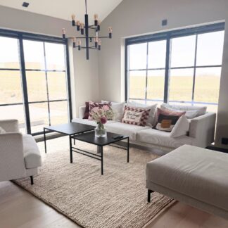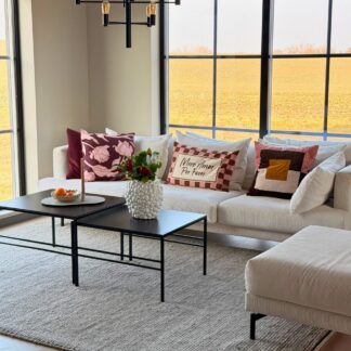 Alla möbler på mattan – hela soffgruppen vilar på mattan. Ger ett lyxigt, hotellaktigt intryck. Kräver en stor vardagsrumsmatta (240x340 cm eller mer).