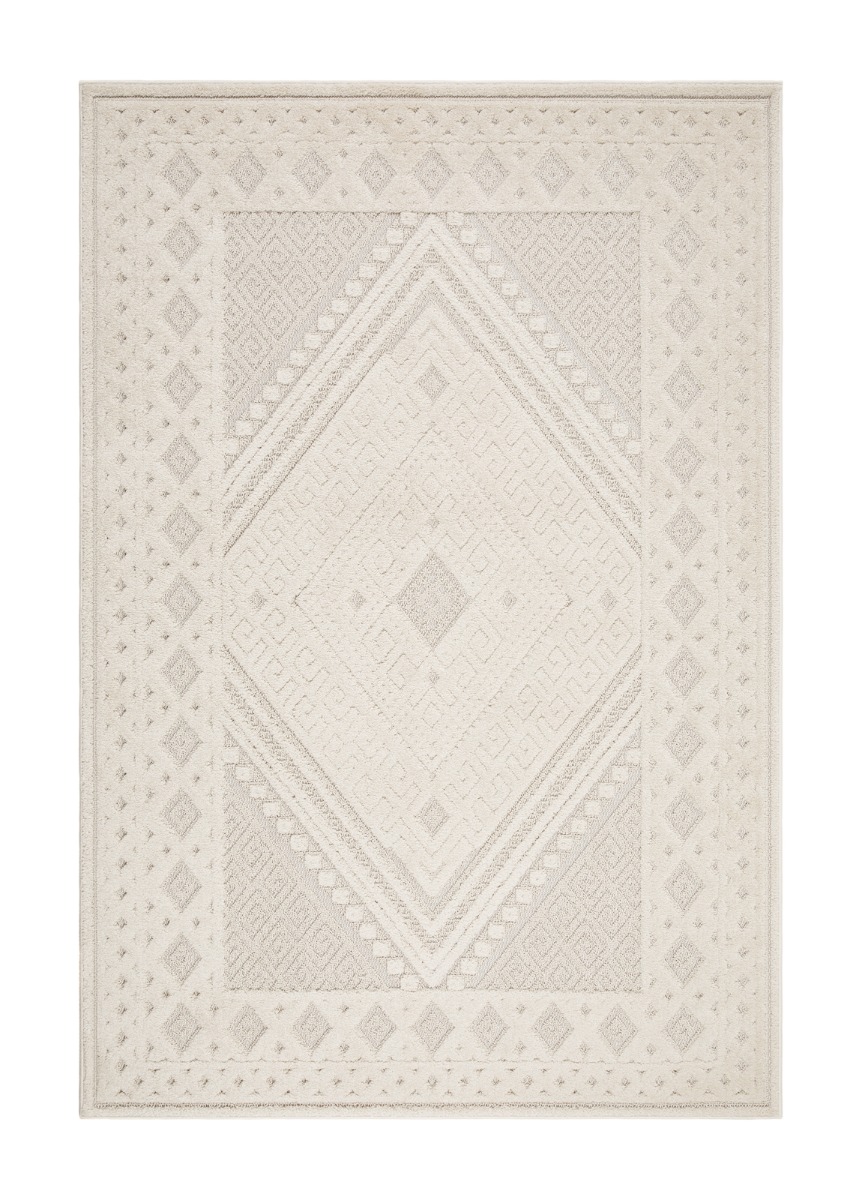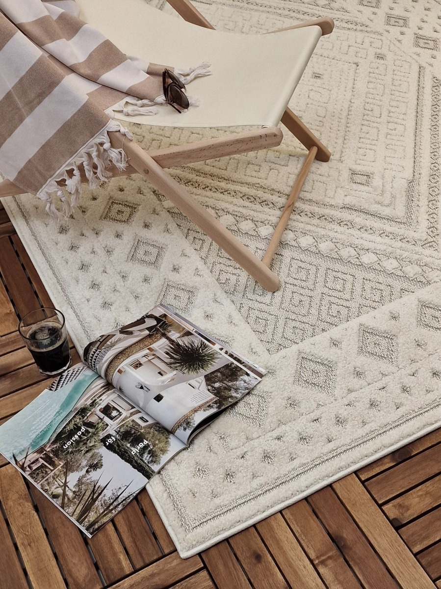 Mjuk och slitstark cremefärgad matta i polypropylen, perfekt för både inomhus- och utomhusmiljöer. Lekfull design med sofistikerad textur som piggar upp ditt hem.